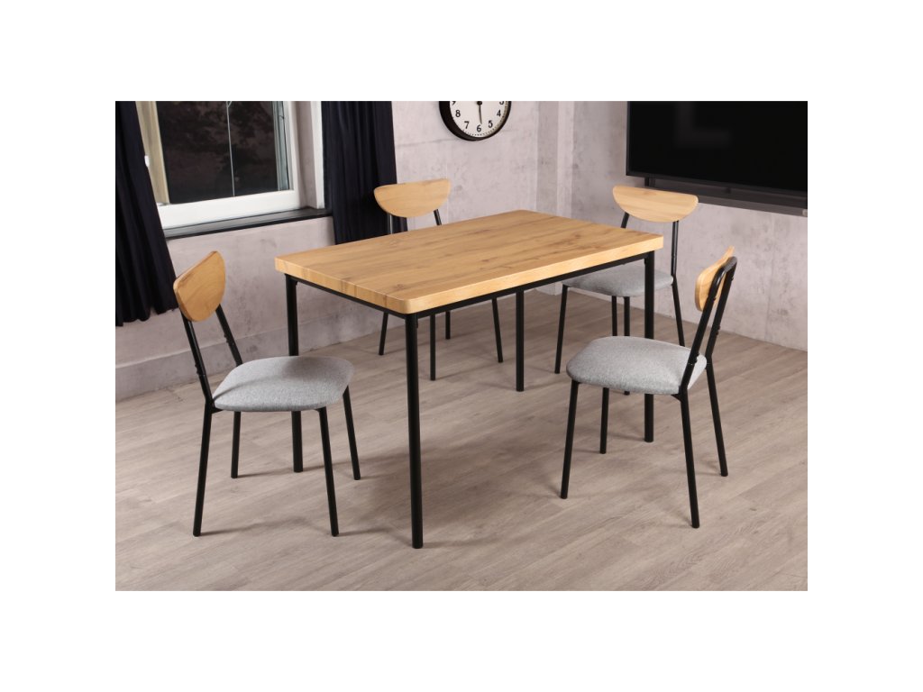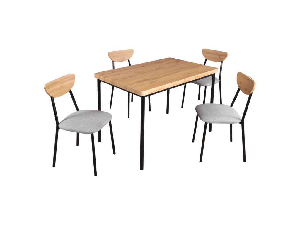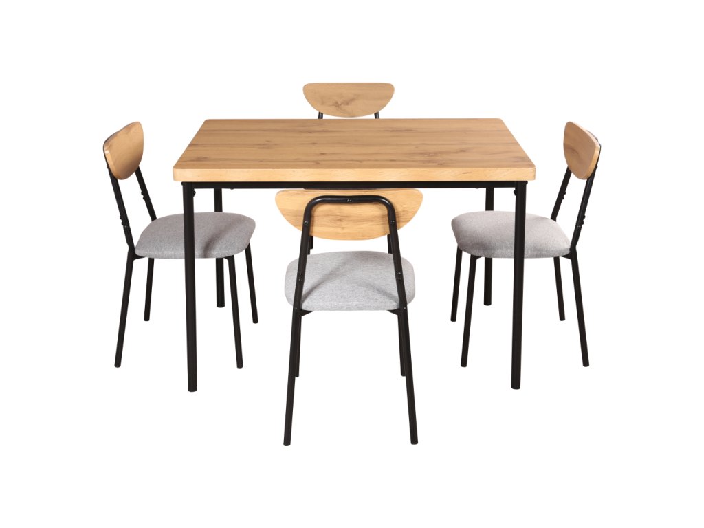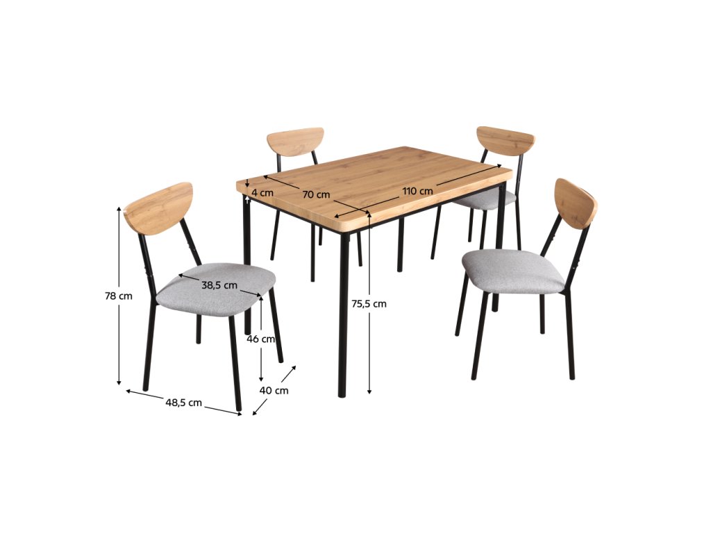 Materiál: MDF/látka/kov Farba: dub svetlý/sivá/čierna Oderuodolnosť textílie podľa testu Martindale: 85 000 oderov Rozmery stôl (ŠxHxV): 110x70x75,5 cm Rozmery stolička (ŠxHxV): 40x47,5x78 cm Výška sedu: 46 cm Hĺbka sedu: 47,5 cm Hrúbka MDF: 1,5 cm Hrúbka platu stola: 4 cm Nosnosť stôl: 20 kg Nosnosť stolička: 90 kg Jedálenský set 1 stôl 4 stoličky Pre 4 osoby Dodávané v demonteBalenie (počet kusov : 1)