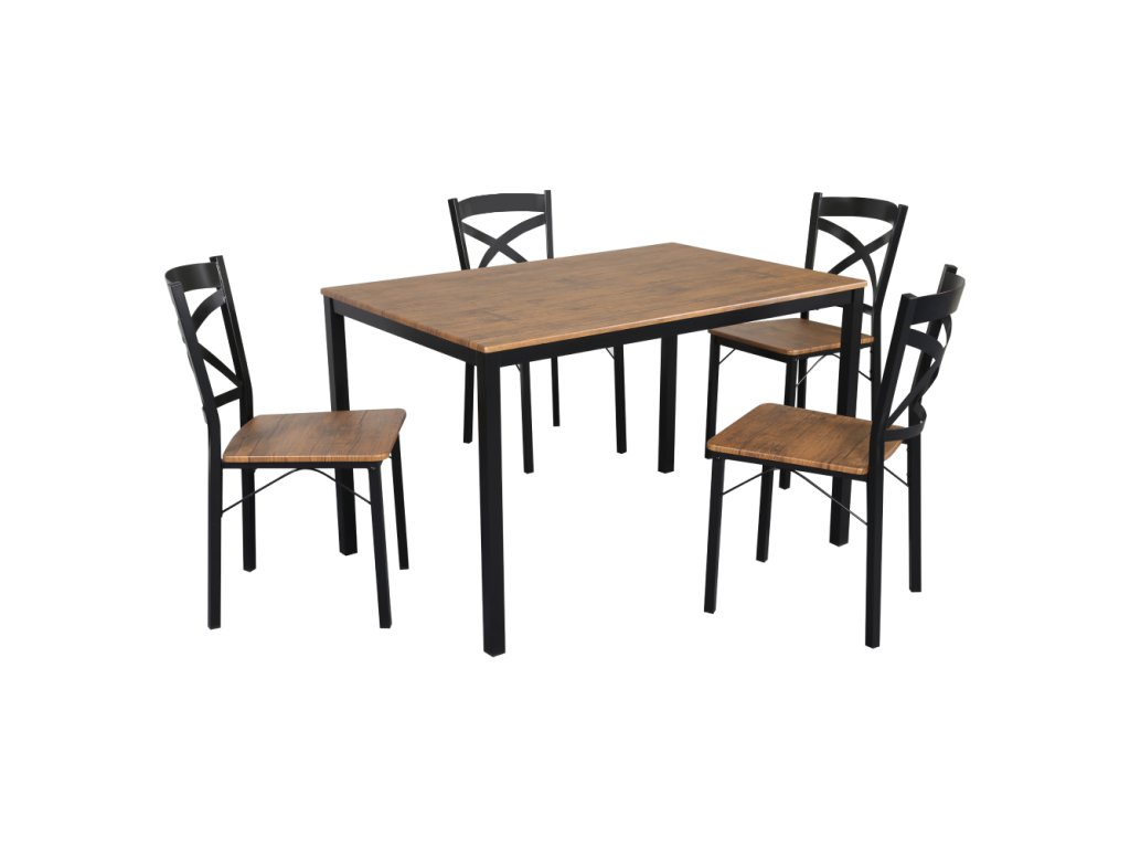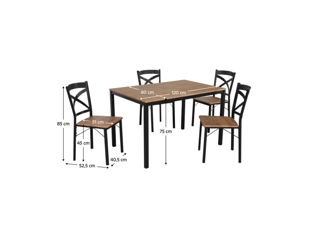 Materiál: MDF/kov Farba: dub tmavý/čierna Rozmery stôl (ŠxHxV): 120x80x75 cm Rozmery stolička (ŠxHxV): 40,5x52,5x85 cm Výška sedu: 45 cm Hĺbka sedu: 51 cm Hrúbka MDF: 1,5 cm Nosnosť stôl: 20 kg Nosnosť stolička: 90 kg Jedálenský set 1 stôl 4 stoličky Pre 4 osoby Dodávané v demonteBalenie (počet kusov : 1)