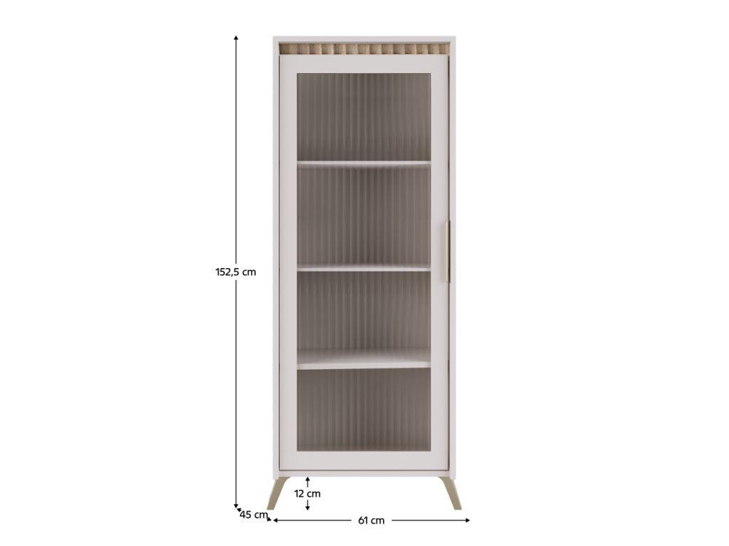 Materiál: laminovaná DTD/fóliovaná MDF/PVC fólia/sklo Farba: kašmír/dub sonoma Rozmery (ŠxHxV): 61x45x152,5 cm Hrúbka materiálu: 1,6-1,9 cm Jednodverová Dvierka so sklom Hrúbka skla: 0,4 cm Leštené sklo Kalené sklo Drážkované sklo Priehľadné sklo Policová S úchytkou Materiál úchytky: kov Na nožičkách Farba nožičiek: prírodná Výška nožičiek: 12 cm Pánty Hrana: papier impregnovaný termosetovými polymérmi/PVC Hrúbka materiálu ABS: 0,5 mm Hrúbka drevovláknitej dosky zadná strana/dno zásuvky: 0,3 cm Farba zadná strana/dno zásuvky: biela Dekoratívne frézovanie Moderný dizajn Dodávané v demonteBalenie (počet kusov : 4)