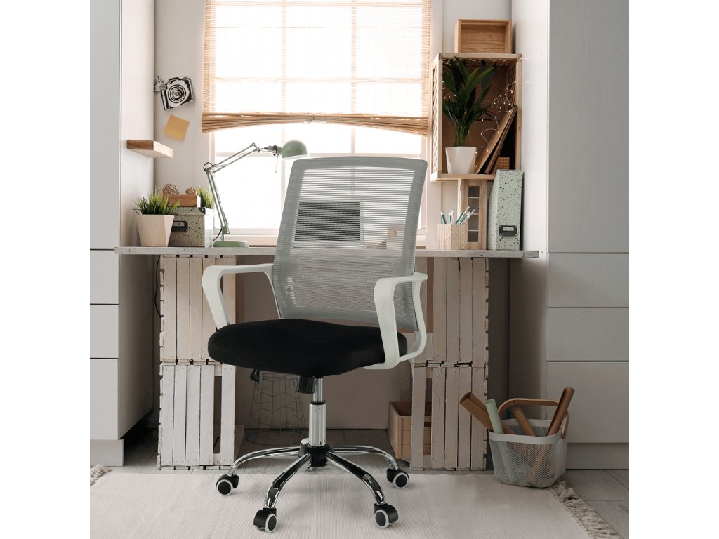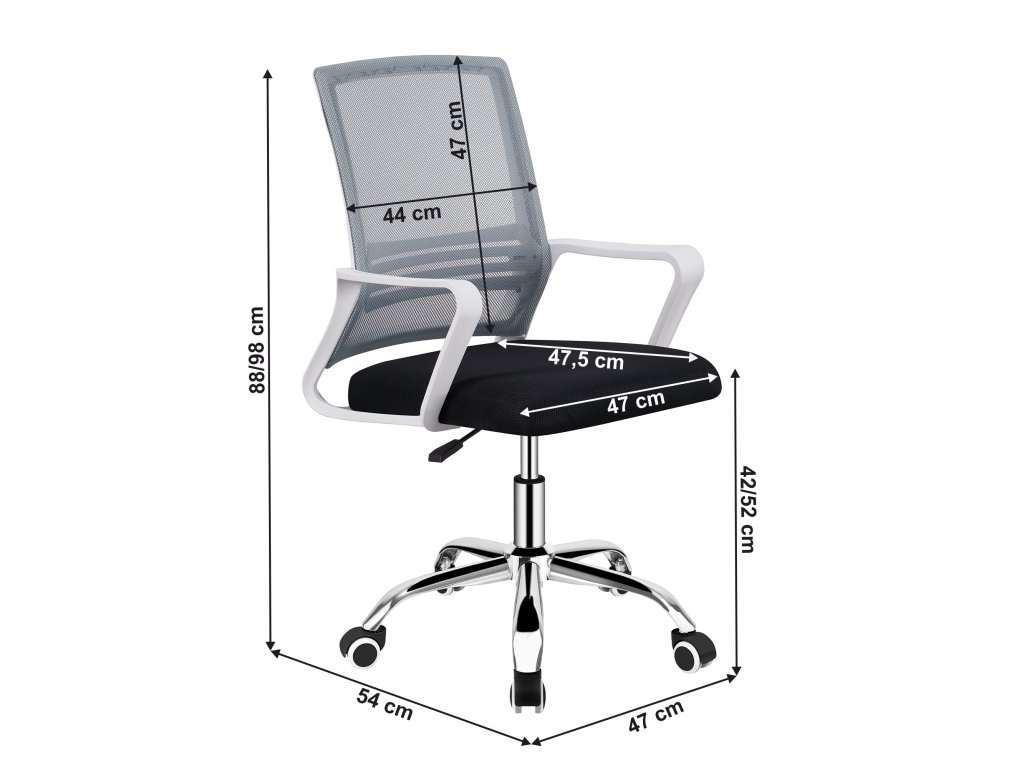 Materiál: sieťovina/plast/kov Oderuodolnosť textílie podľa testu Martindale: 90 000 oderov Farba: sivá/čierna/biela/chróm Rozmery (ŠxHxV): 47x54x88/98 cm Nastaviteľná výška sedu : 42-52 cm Nosnosť: 100 kg Opierka chrbta (ŠxV): 44x47 cm Sedadlo (ŠxH): 47x47,5 cm Dodávané v demonteBalenie (počet kusov : 1)