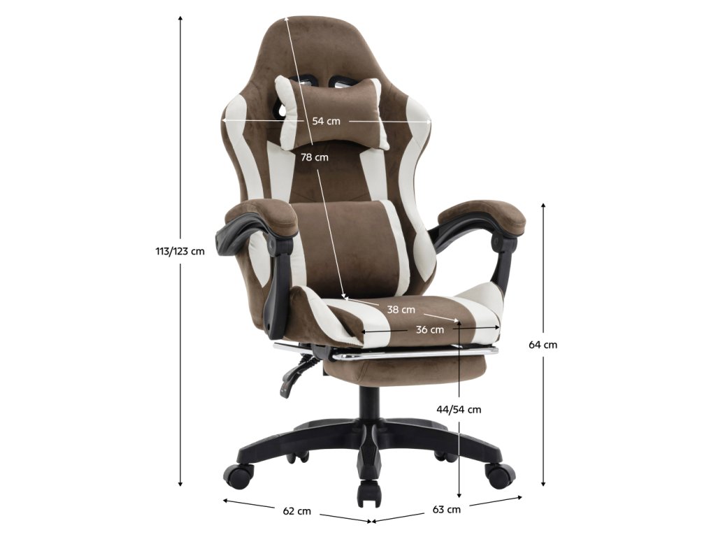 Materiál: látka/plast Oderuodolnosť textílie podľa testu Martindale: 15 000 oderov Farba: hnedá/biela/čierna Rozmery (ŠxHxV): 63x62x113-123 cm Výška sedu: 44-54 cm Šírka sedu: 36 cm Hĺbka sedu: 38 cm Výška chrbtovej opierky: 78 cm Šírka chrbtovej opierky: 54 cm Výška od zeme po opierku na ruky: 64 cm Nosnosť: 130 kg Hmotnosť: 14 kg Nastaviteľná výška sedu Čalúnené opierky na ruky Nastaviteľná opierka hlavy Polohovacia opierka chrbta má sklon 90-135° Odnímateľná opierka hlavy a bedrová opierka Výsuvná podnož Otočné Mechanizmus hojdania Univerzálne kolieska Vhodné na tvrdé aj mäkké podlahy Päťramenná podstava Dodávané v demonteBalenie (počet kusov : 1)