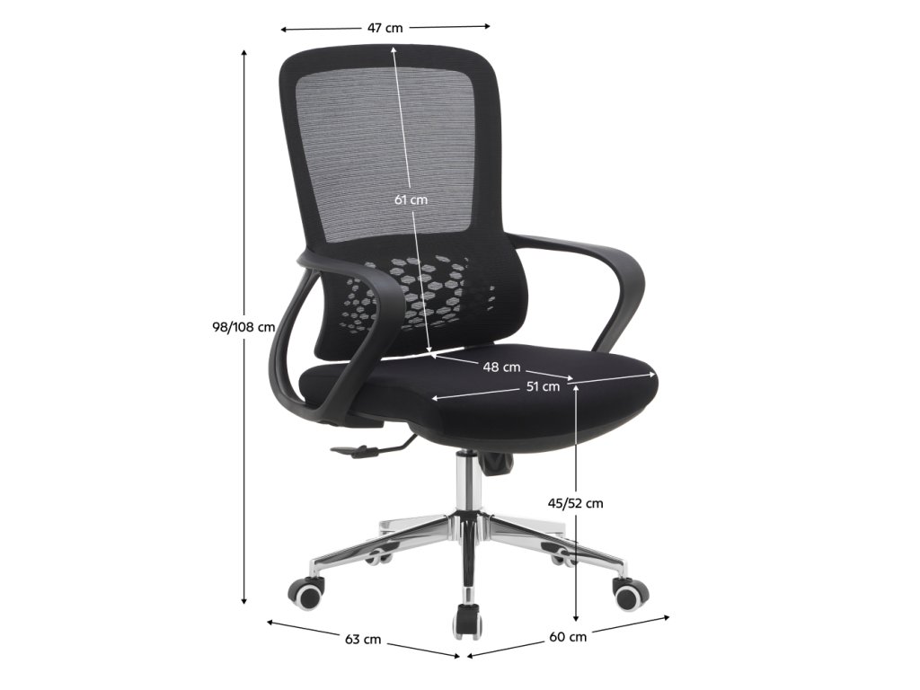 Materiál: sieťovina/látka/plast/kov Oderuodolnosť textílie podľa testu Martindale: 80 000 oderov Oderuodolnosť sieťoviny podľa testu Martindale: 90 000 oderov Farba: čierna/chróm Rozmery (ŠxHxV): 60x63x98-108 cm Výška sedu: 45-52 cm Hĺbka sedu: 48 cm Šírka sedu: 51 cm Šírka chrbtovej opierky: 47 cm Výška chrbtovej opierky: 61 cm Nosnosť: 110 kg Hmotnosť: 10,5 kg Funkcia hojdania Nastaviteľná výška sedu Ergonomicky tvarovaná opierka chrbta v bedrovej časti Univerzálne kolieska Vhodné na mäkké aj tvrdé podlahy Dodávané v demonteBalenie (počet kusov : 1)
