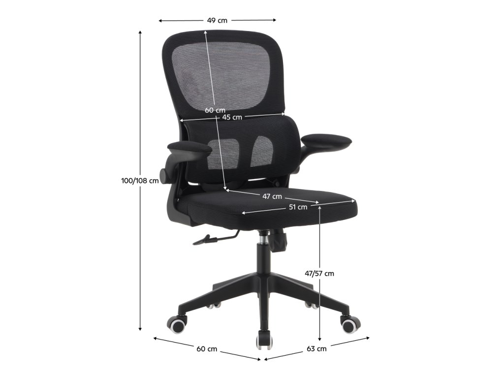 Materiál: sieťovina/plast Oderuodolnosť textílie podľa testu Martindale: 90 000 oderov Farba: čierna Rozmery (ŠxHxV): 63x60x100-108 cm Výška sedu: 47-57 cm Šírka sedu: 51 cm Hĺbka sedu: 47 cm Výška chrbtovej opierky: 60 cm Šírka chrbtovej opierky: 49 cm Nastaviteľná výška sedu S opierkami na ruky Čalúnené opierky na ruky Sklápateľné opierky na ruky Otočné Mechanizmus hojdania Univerzálne kolieska Vhodné na tvrdé aj mäkké podlahy Päťramenná podstava Nosnosť: 110 kg Dodávané v demonteBalenie (počet kusov : 1)