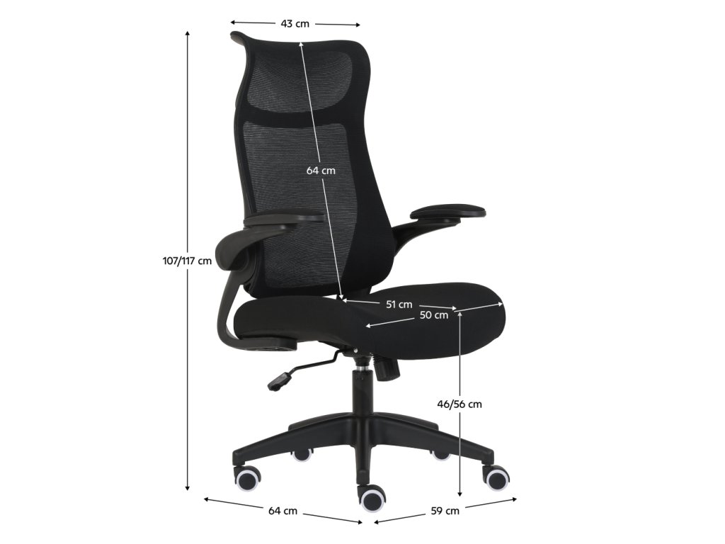 Materiál: sieťovina/plast Oderuodolnosť textílie podľa testu Martindale: 90 000 oderov Farba: čierna Rozmery (ŠxHxV): 59x64x107-117 cm Výška sedu: 46-56 cm Šírka sedu: 50 cm Hĺbka sedu: 51 cm Výška chrbtovej opierky: 64 cm Šírka chrbtovej opierky: 43 cm Nosnosť: 110 kg Hmotnosť: 11,5 kg Nastaviteľná výška sedu S opierkami na ruky Podrúčky s funkciou sklopenia Otočné Mechanizmus hojdania Univerzálne kolieska Vhodné na tvrdé aj mäkké podlahy Päťramenná podstava Dodávané v demonteBalenie (počet kusov : 1)