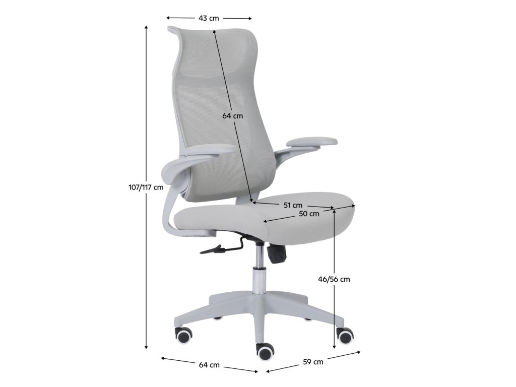 Materiál: sieťovina/plast Oderuodolnosť textílie podľa testu Martindale: 90 000 oderov Farba: sivá Rozmery (ŠxHxV): 59x64x107-117 cm Výška sedu: 46-56 cm Šírka sedu: 50 cm Hĺbka sedu: 51 cm Výška chrbtovej opierky: 64 cm Šírka chrbtovej opierky: 43 cm Nosnosť: 110 kg Hmotnosť: 11,5 kg Nastaviteľná výška sedu S opierkami na ruky Podrúčky s funkciou sklopenia Otočné Mechanizmus hojdania Univerzálne kolieska Vhodné na tvrdé aj mäkké podlahy Päťramenná podstava Dodávané v demonteBalenie (počet kusov : 1)