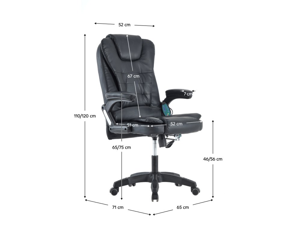 Materiál: ekokoža/plast Oderuodolnosť textílie podľa testu Martindale: 100 000 oderov Farba: čierna Rozmery (ŠxHxV): 65x71x110-120 cm Výška sedu: 46-56 cm Hĺbka sedu: 51 cm Šírka opierky na ruky: 7 cm Nosnosť: 110 kg Hmotnosť: 15,3 kg Opierka chrbta (ŠxV): 52x67cm Sedadlo (ŠxH): 52x51 cm Plastová spodná ružica aj opierky na ruky Opierky na ruky čalúnené ekokožou Funkcia masáže 7 vibračných motorčekov 5 masážnych funkcií Nastavenie intenzity 4 masážne zóny Časovač 15-60 min Polohovateľná opierka chrbta Funkcia hojdania Nastaviteľná výška sedenia Pripojenie kresla cez adaptér S diaľkovým ovládaním Dodávané v demonteBalenie (počet kusov : 1)