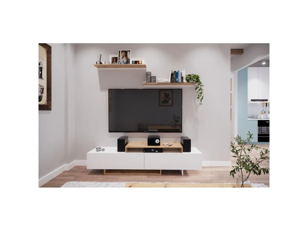 Materiál: laminovaná DTD Farba: biela/dub artisan Rozmery (ŠxHxV): 180x35x50 cm Hrúbka materiálu DTD: 1,6 cm TV stolík 2x závesná polica Rozmery police (ŠxHxV): 90x16,6x10 cm Nosnosť závesnej police: 3 kg Otvorený úložný priestor 2x výklopná skrinka Nosnosť výklopnej skrinky: 7 kg Nosnosť vrchnej dosky: 10 kg Hrana: papier potiahnutý termoreaktívnymi polymérmi Hrúbka DTD zadná strana: 0,3 cm Farba zadná strana: biela Pánty Moderný dizajn Odporúčame pripevniť k stene Dodávané v demonteBalenie (počet kusov : 2)