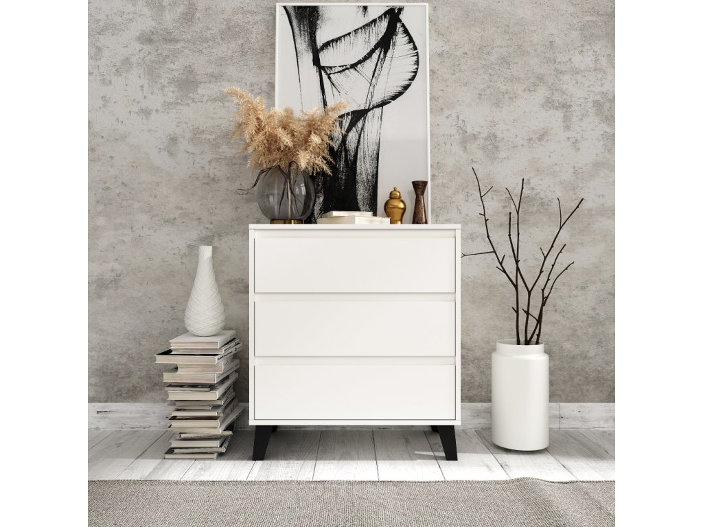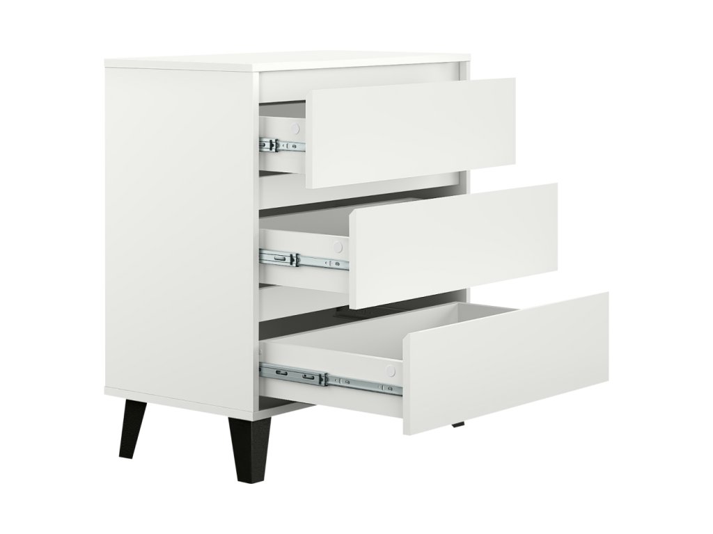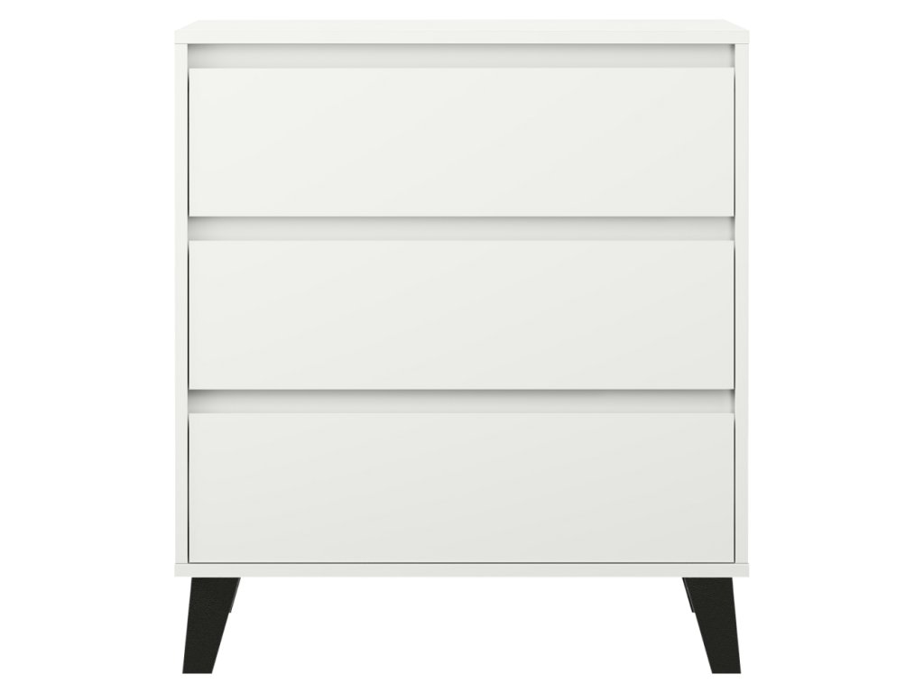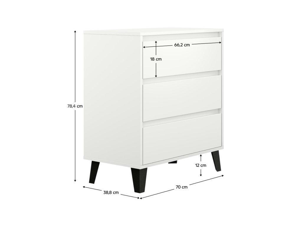 Materiál: laminovaná DTD Farba: biela Rozmery (ŠxHxV): 70x38,8x78,4 cm Výška spodného priestoru od podlahy: 12 cm Tri šuplíky Rozmer šuplíka (ŠxV): 66,2x18 cm Vnútorný rozmer šuplíka (ŠxHxV): 60,8x33,3x9 cm Na nožičkách Farba nožičiek: čierna Nosnosť šuplíka: 5 kg Nosnosť vrchnej dosky: 15 kg Moderný štýl Bez úchytiek Odporúčame pripevniť k stene Dodávané v demonteBalenie (počet kusov : 2)