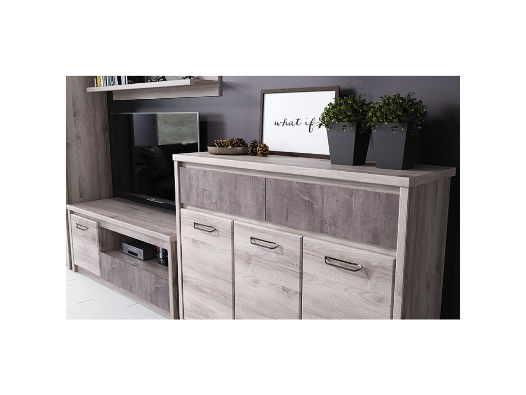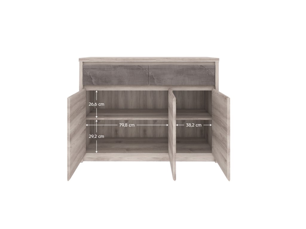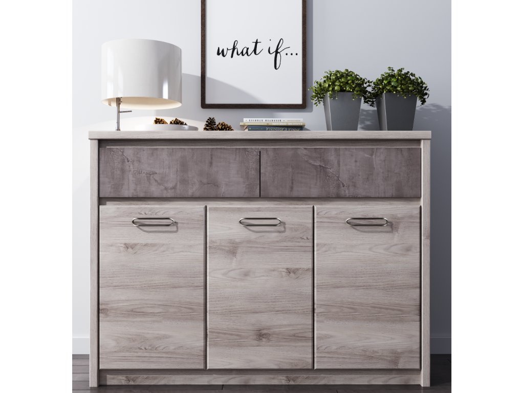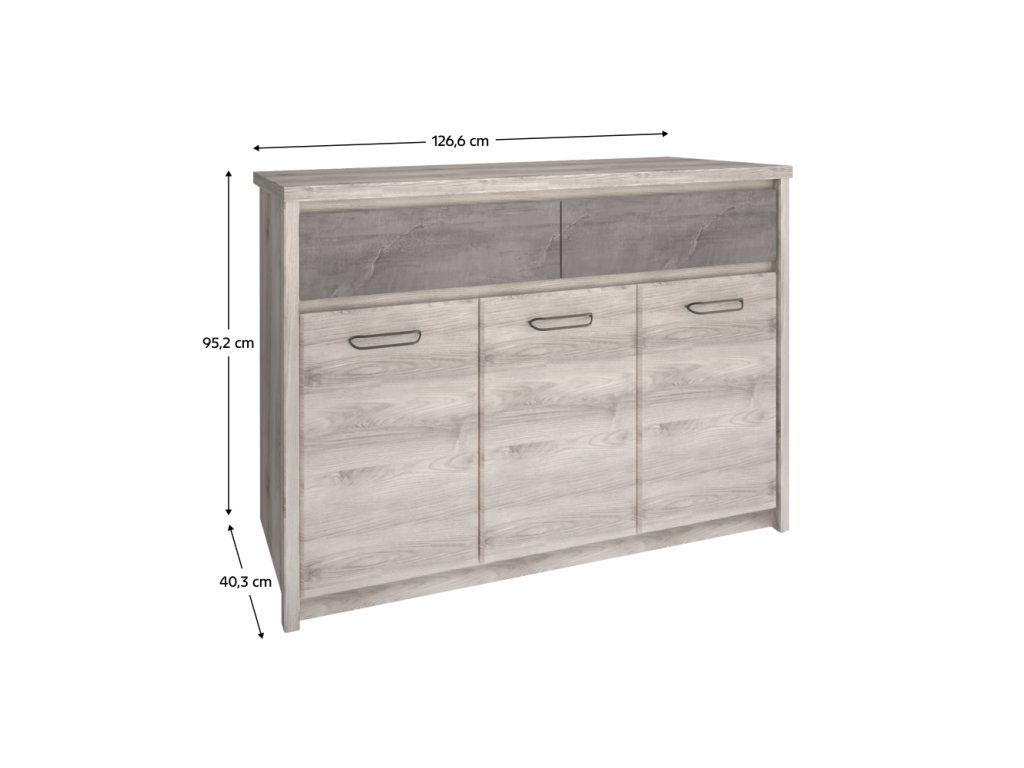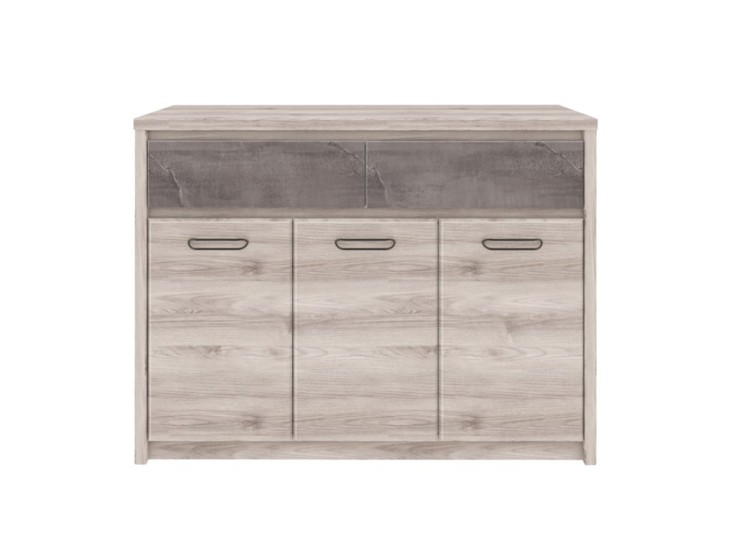 Materiál: DTD laminovaná Farba: gaštan nairobi/onyx Rozmery (ŠxHxV): 126,6x95,2x40,3 cm Hrúbka materiálu: 1,6-3,2 cm Plastové nožičky Kovové úchytky Farba úchytiek: čierna Trojdverová Dva šuplíky Nosnosť šuplíka: 5 kg Moderný dizajn Dodávané v demonteBalenie (počet kusov : 4)