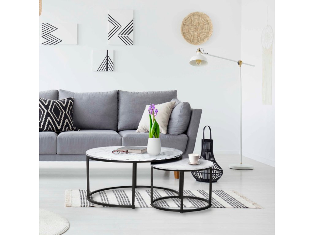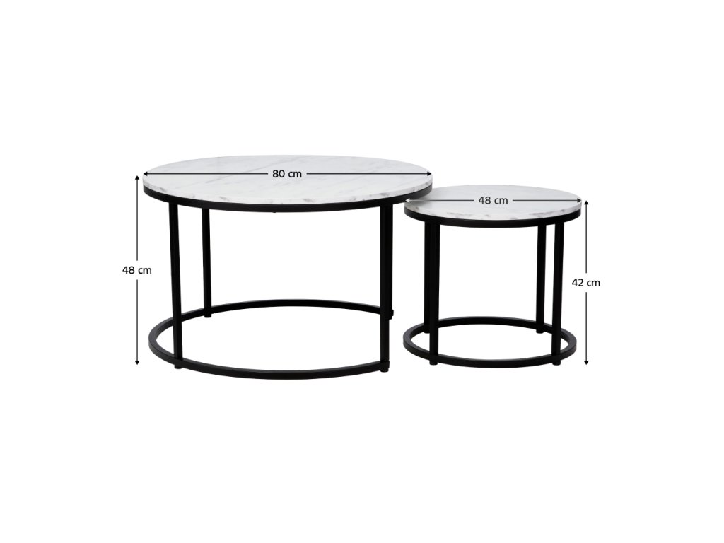 Materiál: DTD laminovaná/kov Farba: biela/čierna Väčší stolík (priemer x V): 80x48 cm Menší stolík (priemer x V): 48x42 cm Hrúbka materiálu: 1,5 cm Nosnosť: 40 kg Set dvoch stolíkov Možnosť zasunutia menšieho pod väčší stolík Okrúhly Moderný Dodávané v demonteBalenie (počet kusov : 1)