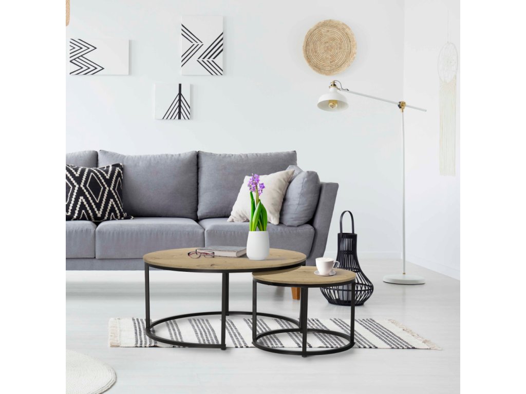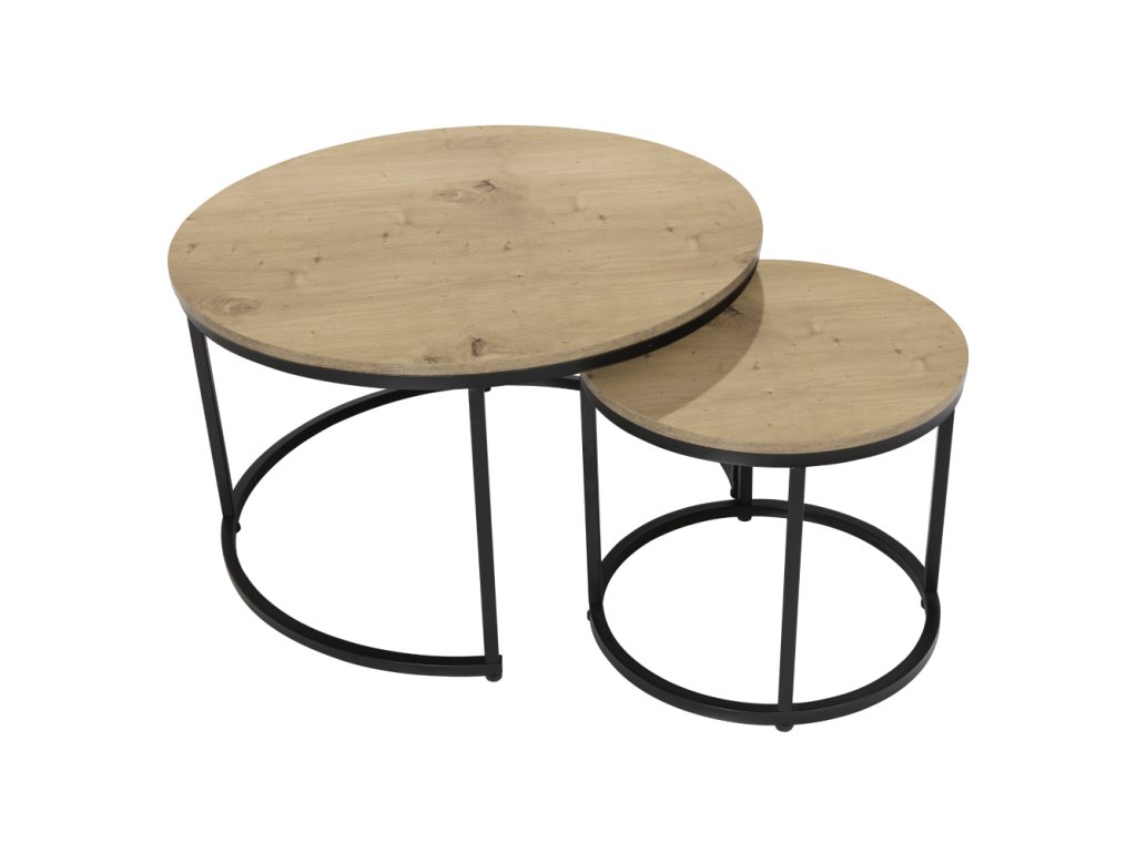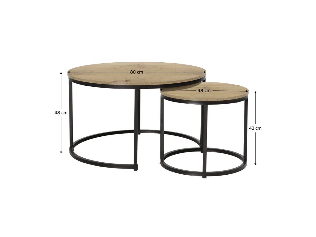 Materiál: DTD laminovaná/kov Farba: čierna/dub Väčší stolík (priemer x V): 80x48 cm Menší stolík (priemer x V): 48x42 cm Hrúbka materiálu: 1,5 cm Nosnosť: 40 kg Set dvoch stolíkov Možnosť zasunutia menšieho pod väčší stolík Okrúhly Moderný Dodávané v demonteBalenie (počet kusov : 1)