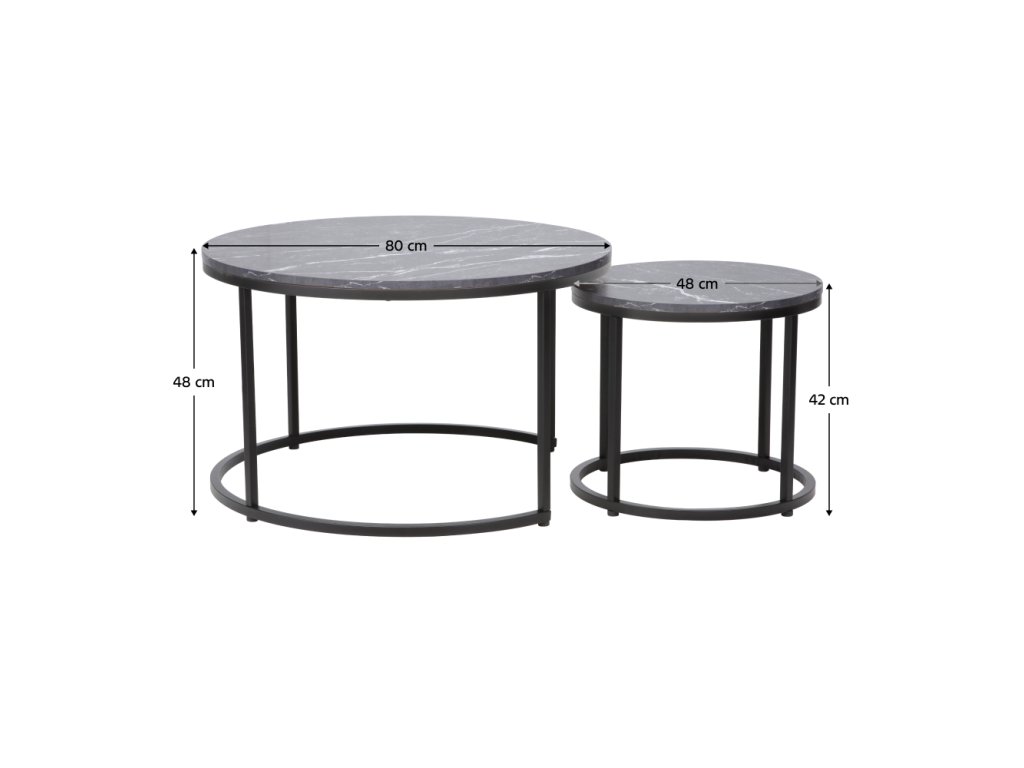 Materiál: DTD laminovaná/kov Farba: tmavosivá/čierna Väčší stolík (priemer x V): 80x48 cm Menší stolík (priemer x V): 48x42 cm Hrúbka materiálu: 1,5 cm Nosnosť: 40 kg Set dvoch stolíkov Možnosť zasunutia menšieho pod väčší stolík Okrúhly Moderný Dodávané v demonteBalenie (počet kusov : 1)