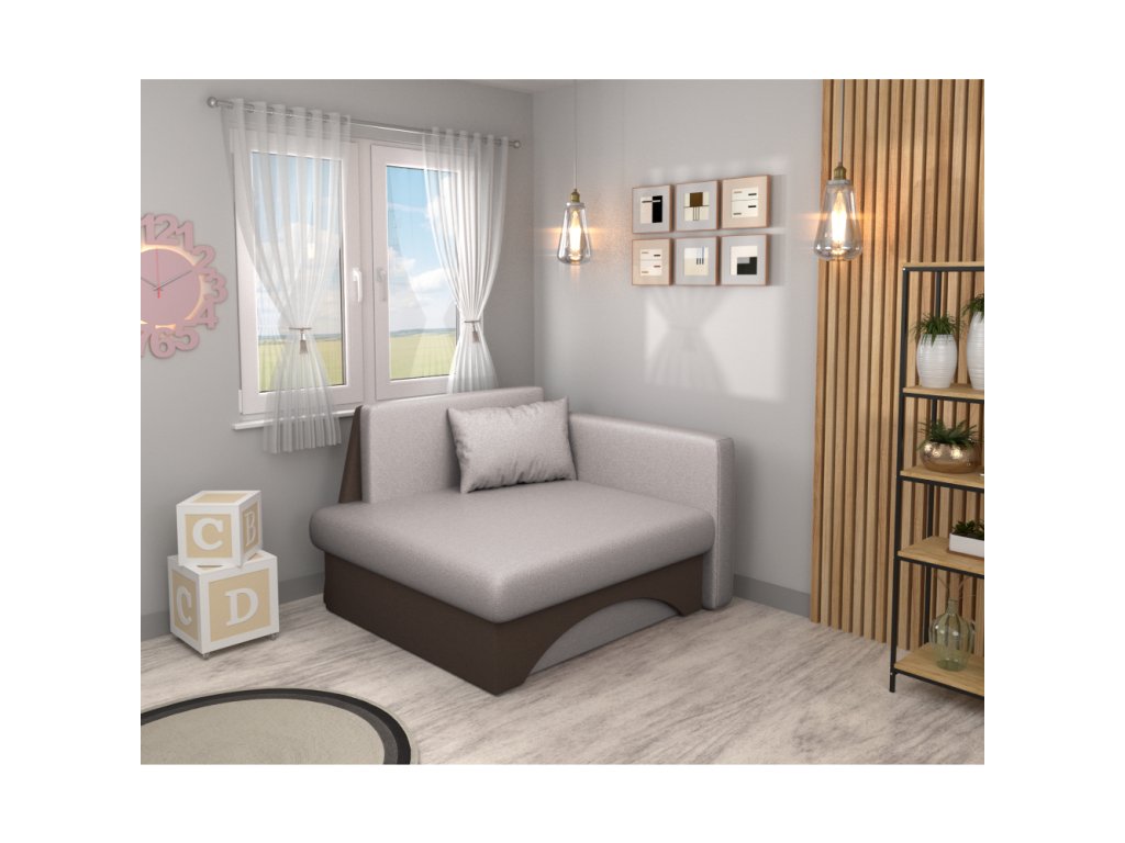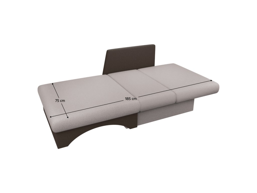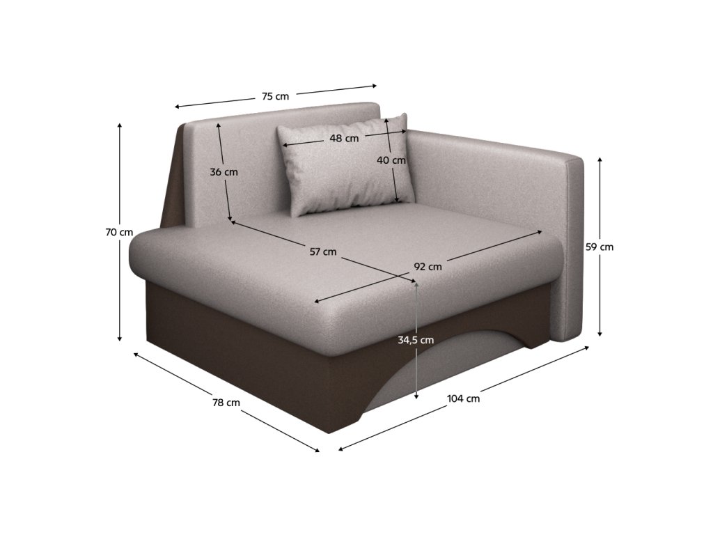 Materiál: látka Malmo 08/26 Oderuodolnosť textílie podľa testu Martindale: 30 000 oderov Farba: béžovosivá Taupe/hnedá Rozmery (ŠxHxV): 104x78x70 cm Plocha na spanie: 75x185 cm Výška sedu: 34,5 cm Hĺbka sedu: 57 cm Šírka sedu: 92 cm Výška opierky na ruku od zeme: 59 cm Rozmery opierky na chrbát (ŠxV): 75x36 cm Nosnosť na osobu: 90 kg Dodávané s vankúšom Rozmery vankúša (ŠxV): 48x40cm Rozkladacie Úložný priestor Pravé prevedenie Výplň: pur pena T28 Dodávané v monteBalenie (počet kusov : 1)