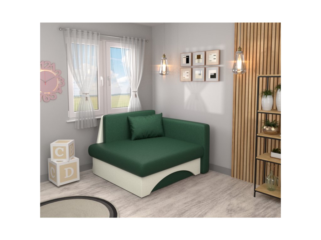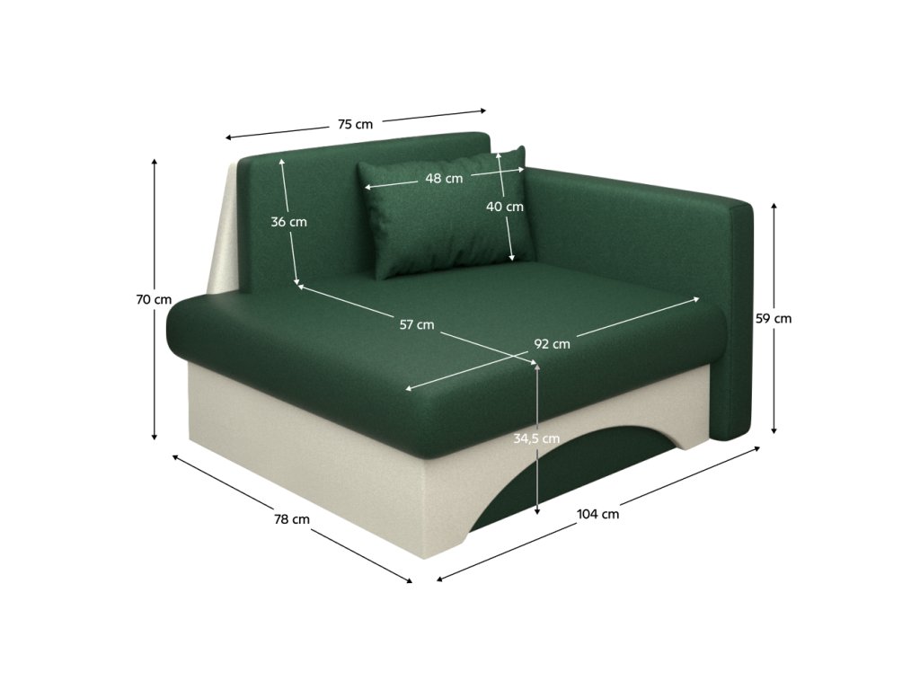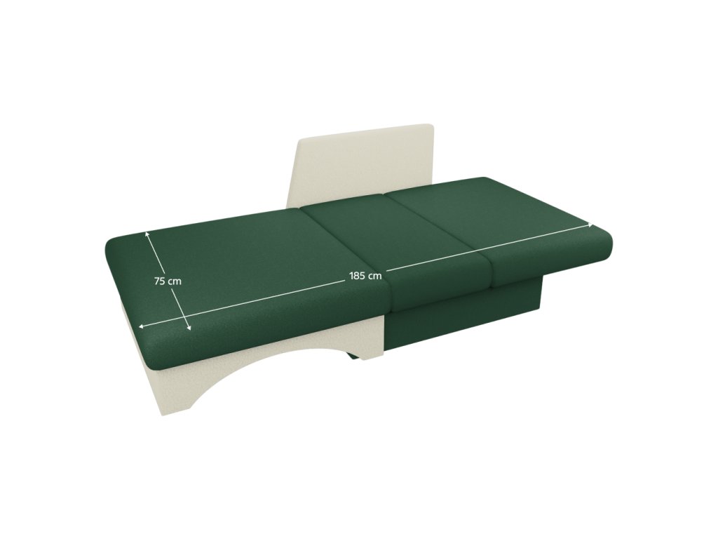Materiál: látka Malmo 37/05 Oderuodolnosť textílie podľa testu Martindale: 30 000 oderov Farba: zelená/bežová Rozmery (ŠxHxV): 104x78x70 cm Plocha na spanie: 75x185 cm Výška sedu: 34,5 cm Hĺbka sedu: 57 cm Šírka sedu: 92 cm Výška opierky na ruku od zeme: 59 cm Rozmery opierky na chrbát (ŠxV): 75x36 cm Nosnosť na osobu: 90 kg Dodávané s vankúšom Rozmery vankúša (ŠxV): 48x40cm Rozkladacie Úložný priestor Pravé prevedenie Výplň: pur pena T28 Dodávané v monteBalenie (počet kusov : 1)