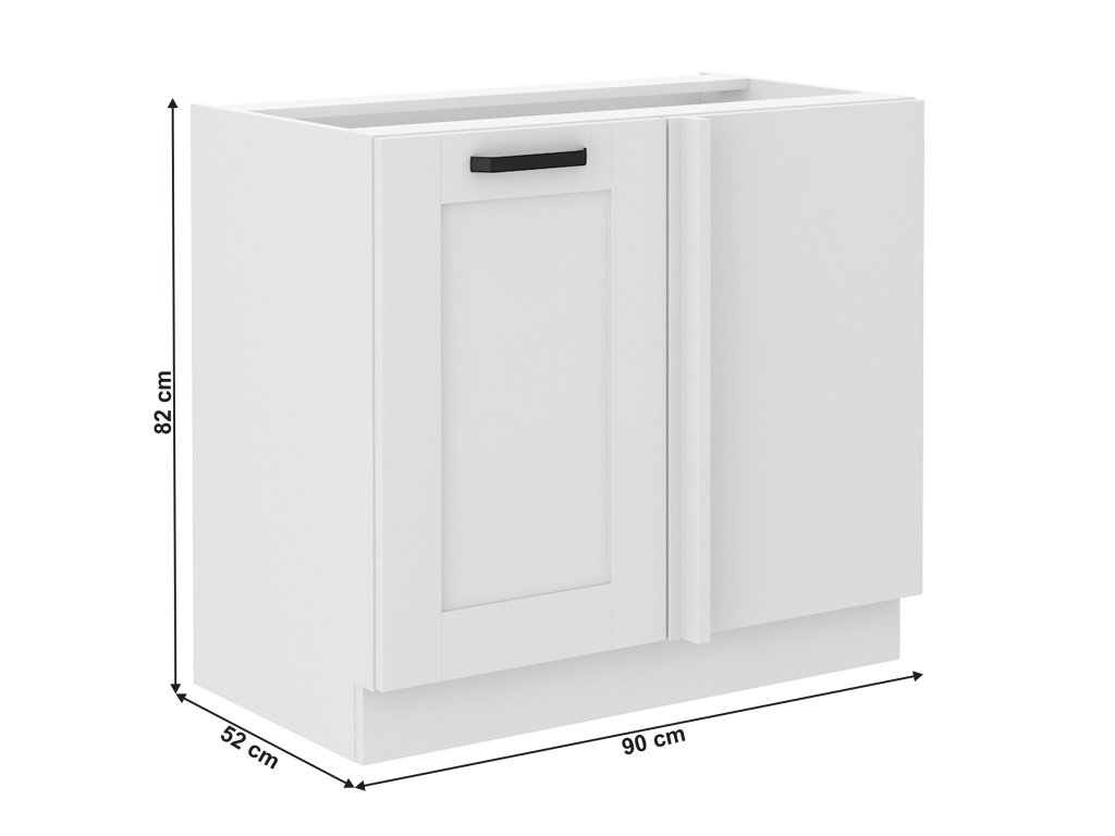 Spodná skrinka LULA 105 ND 1F BB Materiál: laminovaná DTD/MDF Farba: biela/ Rozmery (ŠxHxV): 90x52x82 cm Hrúbka materiálu: 1,6 cm Hrúbka dvierok: 2 cm Rohová Skrinka určená do rohu rohovej kuchynskej linky Skrinka zaberá v priestore 105 cm, z dôvodu, že je potrebné ju odsunúť od steny 15 cm Je nutné na túto skrinku zakúpiť pracovnú dosku s dĺžkou 105 cm 1 dvierka S kovovou úchytkou Farba úchytky: čierna S dolnou lištou/soklom Systém tichého zatvárania dvierok Dvierka viete namontovať z pravej alebo ľavej strany Moderný dynamický dizajn Dodávané v demonte Spodné skrinky sú dodávané vrátane dolnej lišty, bez pracovnej dosky. Možnosť dokúpenia pracovnej dosky dub artisan alebo marmur roma v cene 59 Eur/bm. Možnosť dokúpiť univerzálny drez LAY ON.Balenie (počet kusov : 2)