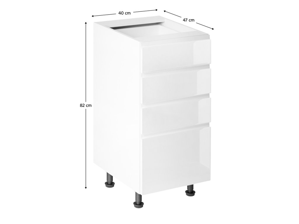 Spodná skrinka, Aurora D40S4 Materiál: DTD laminovaná/MDF Farba: biela/biela extra vysoký lesk Rozmery (ŠxHxV): 40x47x82 cm Hrúbka materiálu : 15 mm 4 šuplílky Bez úchytiek Šuplík typu METALBOX Systém tichého dorazu šuplíkov Je nutné objednať potrebný počet ukončení spodnej lišty Spodnú lištu je potrebné objednať zvlášť, pričom daný rozmer treba uviesť do poznámky Potrebné doobjednať 2 ks úchytov na sokel - cena 1Eur/2ks Dodávané v demonte Pracovná doska nie je súčasťou skriniek. Je možné si doobjednať pracovnú dosku v prevedení dub artisan s hrúbkou 38 mm za 59 eur/bm. Možnosť dokúpiť drez, drezovú batériu a príslušenstvo. Ku spodným skrinkám máte možnosť dokúpiť spodnú lištu/sokel v bielej farbe s rozmerom 1 bm za 8 eur alebo s rozmerom 2 bm za 16 eur a ukončenie na sokel s hĺbkou 47 cm alebo 58 cm za 5 eur. Ku každej dolnej skrinke, okrem D25PZ, je potrebné doobjednať 2 ks úchytok na sokel - cena 1Eur/2ks.Balenie (počet kusov : 2)