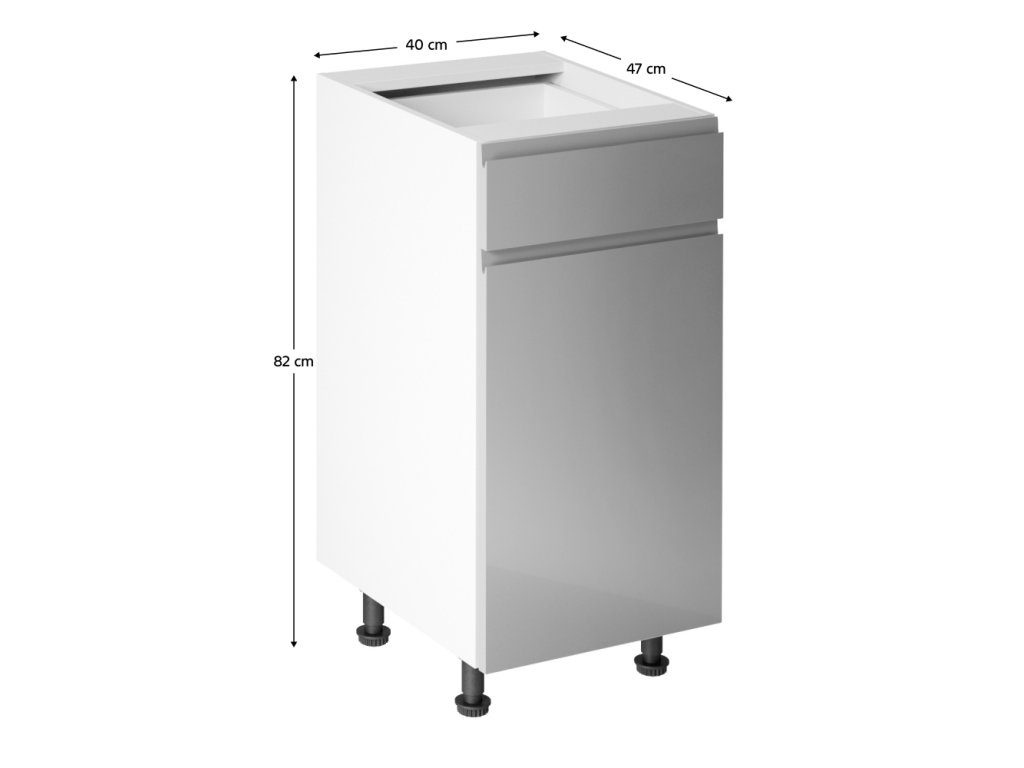 Materiál: DTD laminovaná/MDF Farba: biela/sivá extra vysoký lesk Rozmery (ŠxHxV): 40x47x82 cm Hrúbka materiálu : 15 mm Systém tichého zatvárania dvierok S jedným šuplíkom Dve police Šuplík typu METALBOX Systém tichého dorazu šuplíkov Univerzálna Je nutné objednať potrebný počet ukončení spodnej lišty Spodnú lištu je potrebné objednať zvlášť, pričom daný rozmer treba uviesť do poznámky Potrebné doobjednať 2 ks úchytov na sokel - cena 1Eur/2ks Dodávané v demonte Pracovná doska nie je súčasťou skriniek. Je možné si doobjednať pracovnú dosku v prevedení dub artisan s hrúbkou 38 mm za 59 eur/bm. Možnosť dokúpiť drez, drezovú batériu a príslušenstvo. Ku spodným skrinkám máte možnosť dokúpiť spodnú lištu/sokel v bielej farbe s rozmerom 1 bm za 8 eur alebo s rozmerom 2 bm za 16 eur a ukončenie na sokel s hĺbkou 47 cm alebo 58 cm za 5 eur. Ku každej dolnej skrinke, okrem D25PZ, je potrebné doobjednať 2 ks úchytok na sokel - cena 1Eur/2ks.Balenie (počet kusov : 2)