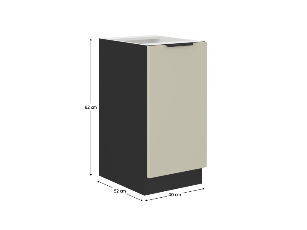 Materiál: laminovaná DTD Farba dvierok: cashmere Farba korpus: čierny mat Rozmery (ŠxHxV): 40x52x82 cm Hrúbka materiálu: 1,6 cm S dvierkami Policová S úchytkou Farba úchytky: alumíniová Bez pracovnej dosky S dolnou lištou/soklom Systém tichého zatvárania dvierok Moderný dizajn Možnosť dokúpiť univerzálny drez LAY ON Dodávané v demonte Spodné skrinky sú dodávané vrátane dolnej lišty, bez pracovnej dosky. Možnosť dokúpenia pracovnej dosky marmur roma v cene 59 Eur/bm. Možnosť dokúpiť univerzálny drez LAY ON.Balenie (počet kusov : 2)
