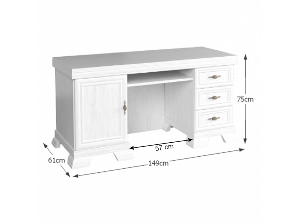 PC stôl KORA KB NEW Materiál: laminovaná DTD/MDF/kov Farba: sosna andersen Rozmery (ŠxHxV): 149x61x75 cm Hrúbka materiálu korpus: 15 mm Hrúbka materiálu vrchnej dosky: 22 mm Hrúbka materiálu dolnej dosky: 22 mm Šírka priestoru na stoličku: 57 cm Rustikálny štýl Ozdobné lišty Kovové úchytky Skrinka s dvierkami Tri šuplíky Výsuv na klávesnicu Dodávané v demonteBalenie (počet kusov : 3)