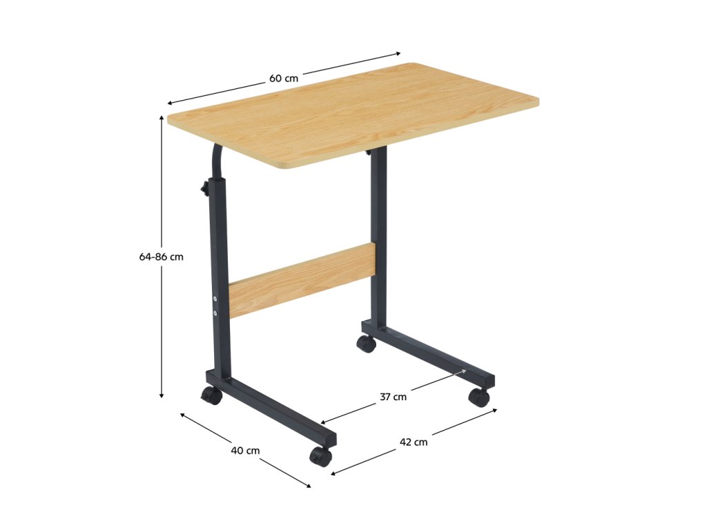 Materiál: fóliovaná MDF/kov Farba: dub/čierna Rozmery (ŠxHxV): 60x40x64-86 cm Hrúbka materiálu: 1,2 cm Nosnosť: 10 kg Hmotnosť: 3,2 kg Pojazdný Na kolieskach S dvoma brzdami Nastaviteľná výška stola Mobilný Viacúčelový Moderný Praktický Dodávaný v demonteBalenie (počet kusov : 1)