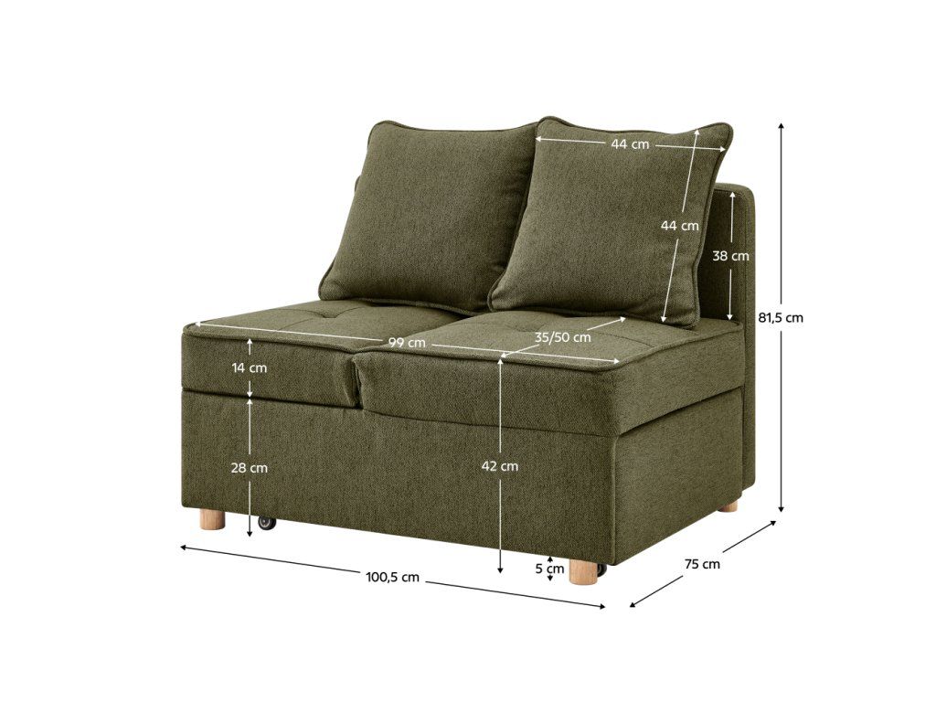 Materiál: látka Neve 39/drevo/kov Oderuodolnosť látky podľa testu Martindale: 80 000 oderov Farba: zelená Rozmery (ŠxHxV): 100,5x75x81,5 cm Plocha na spanie (ŠxD): 66x184 cm Výška sedu: 42 cm Výška sedu bez matraca: 28 cm Hĺbka sedu: 35 cm Hĺbka sedu bez vankúšov: 50 cm Šírka sedu: 99 cm Šírka po rozložení: 184 cm Výška chrbtovej opierky: 38 cm Šírka chrbtovej opierky: 99 cm Výška matraca: 14 cm Nosnosť: 90 kg na osobu Výplň: molitán Na nožičkách Materiál nožičiek: bukové drevo Farba nožičiek: prírodná Výška spodného priestoru od podlahy: 5 cm 2-sed Pohovka Celočalúnená Rozkladacia Polohovateľná opierka hlavy 5 stupňov polohovania Dodávaná s vankúšmi Rozmery vankúšov (ŠxHxV): 44x15x44 cm Dekoratívne prešitie Praktická Moderný dizajn Dodávané v demonteBalenie (počet kusov : 1)