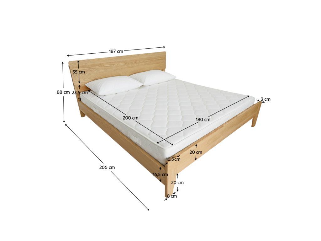 Materiál: kaučukové drevo Povrchová úprava masívneho dreva: lak Farba: prírodná Rozmery (ŠxHxV): 187x206x88 cm Plocha na spanie (ŠxD): 180x200 cm Výška po rošt: 29,5 cm Nosnosť na lôžko: 140 kg Dodávané s roštom Rošt obsahuje borovicové laty Hrúbka laty: 1,3 cm Šírka lát: 7 cm Priestor medzi latami: 5,5 cm Dodávané bez matraca Odporúčame zakúpiť matrac s rozmerom 180x200 cm Zapustenie matraca: 2 cm Odporúčaná výška matraca: 22 cm Dodávaná bez vankúšov, nočných stolíkov a dekorácií Dodávané v demonteBalenie (počet kusov : 4)
