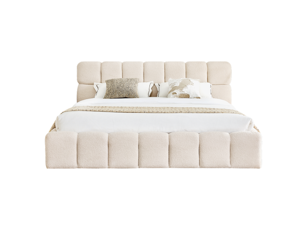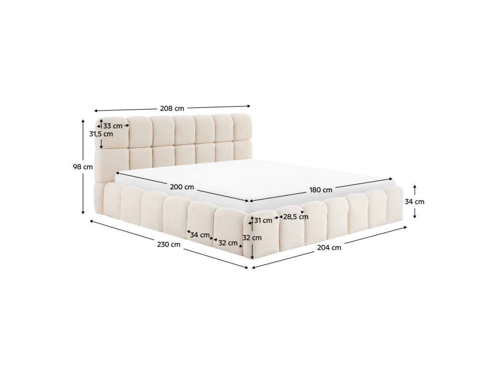 Materiál: látka Bouclé/DTD/pena Oderuodolnosť textílie podľa testu Martindale: 40 000 oderov Farba: béžová Rozmery (ŠxHxV): 208x230x98 cm Plocha na spanie (ŠxD): 180x200 cm Výška po rošt: 24 cm Výška bočnice: 34 cm Šírka bočnice: 11,5 cm Výška čela: 98 cm Výška čela od bočnice: 64 cm Hrúbka čela: 17 cm Hrúbka čela pri nohách: 11,5 cm Nosnosť na lôžko: 140 kg S úložným priestorom S vysokým čelom Prešívané čelo Dodávané s roštom Výklopný rošt s kovovým rámom Plynové piesty Lamely z topoľovej preglejky Dodávané bez matraca Možnosť zakúpiť matrace z našej ponuky Odporúčaná výška matraca: 20 cm Zapustenie matraca: 7 cm Na nožičkách Materiál nožičiek: kov Farba nožičiek: čierna Rozmery nožičiek (ŠxHxV): 4x4x2,4 cm Elegantný dizajn Dodávané v demonteBalenie (počet kusov : 3)