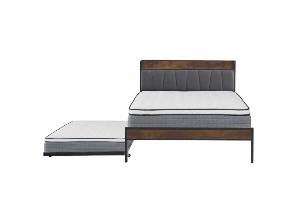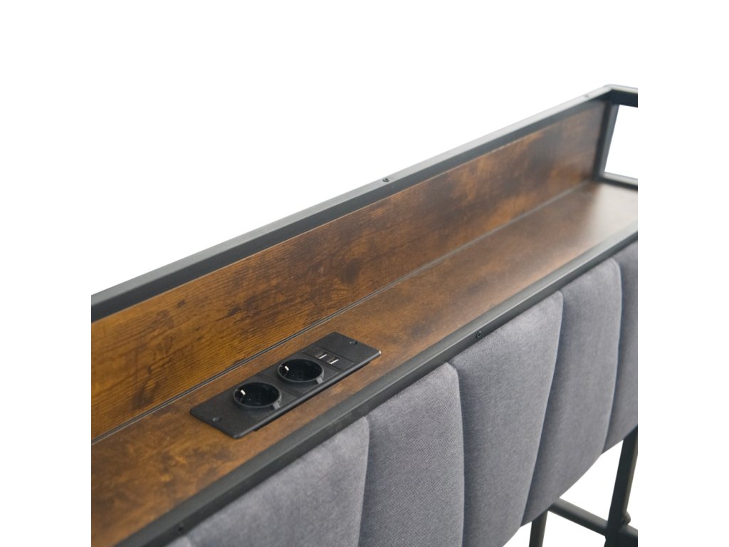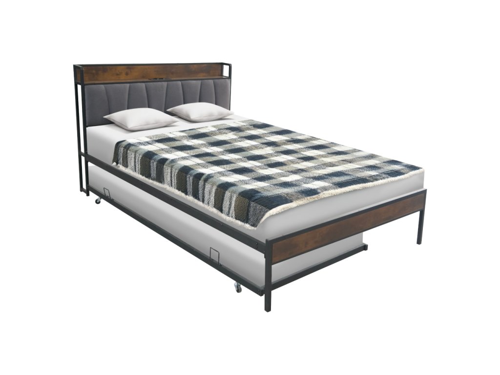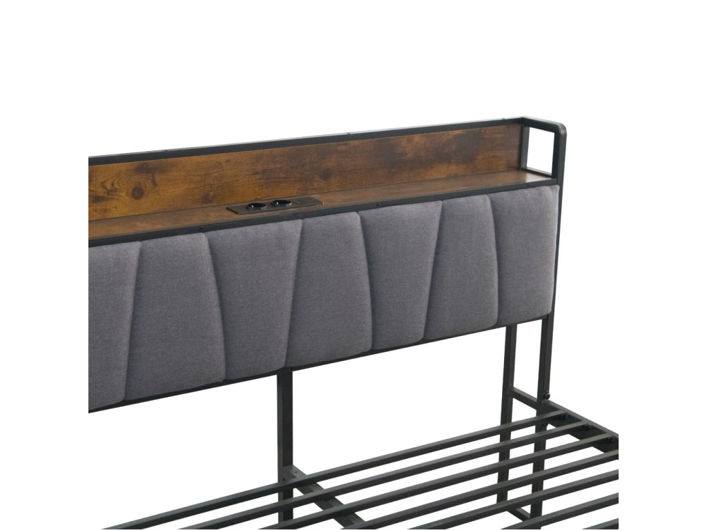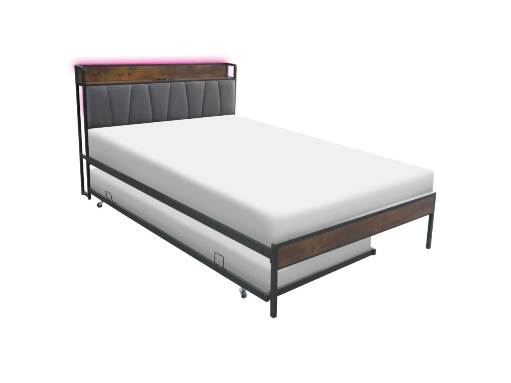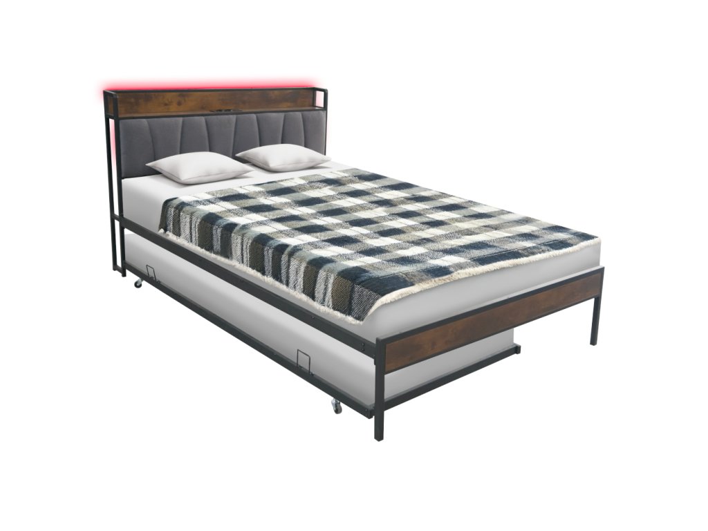 Materiál: kov/MDF/ľanová tkanina Oderuodolnosť textílie podľa testu Martindale: 20 000 oderov Farba: čierna/rustikálne drevo/sivá Rozmery (ŠxHxV): 140x218,5x100 cm Plocha na spanie (ŠxD): 140x200 cm Nosnosť na lôžko: 150 kg S policou Nosnosť police: 20 kg 2× elektrická zásuvka 2× USB port Dodávané s LED osvetlením Počet farieb LED osvetlenia: 16 S diaľkovým ovládačom Dodávaná s kovovým roštom Dodávané bez matraca Odporúčame zakúpiť matrac z našej ponuky Odporúčaná výška matraca: 15-20 cm S prístelkou Nosnosť na prístelku: 200 kg Na kolieskách Rozmery prístelky (ŠxHxV): 90x200x9,5 cm Rozmer matraca na prístelku: 90x200 cm Odporúčaná výška matraca na prístelku: 15-18 cm Rustikálny štýl Dodávané v demonteBalenie (počet kusov : 1)