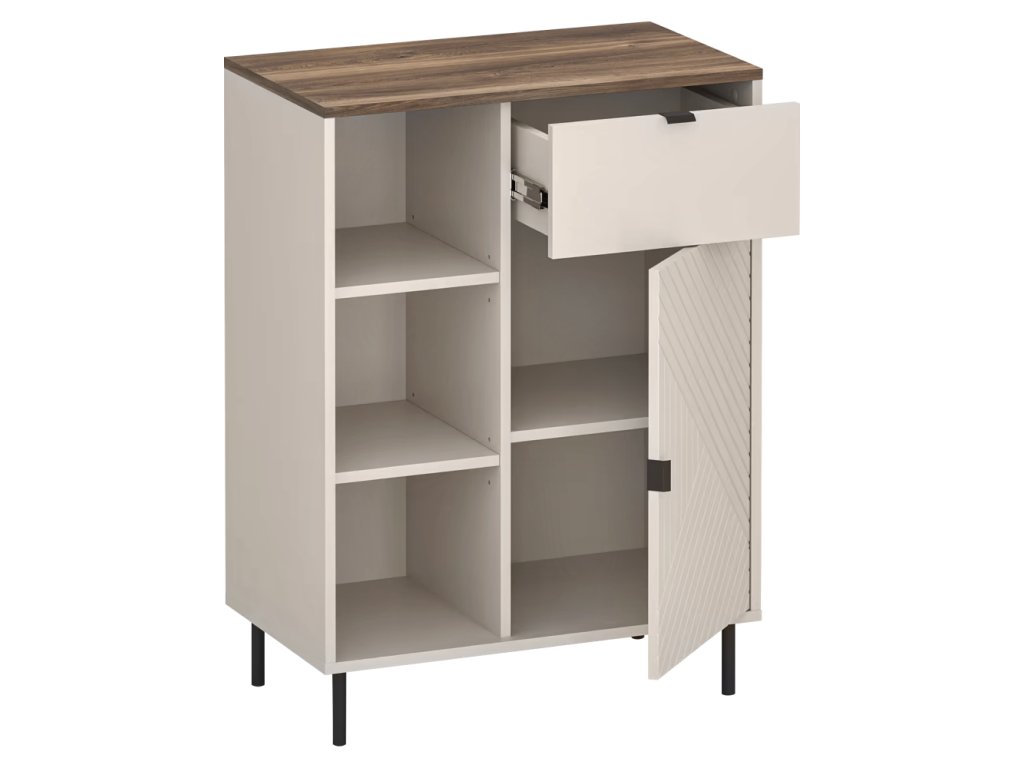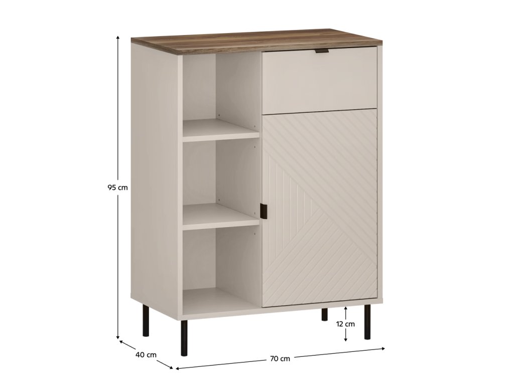 Materiál: laminovaná DTD/fóliovaná MDF/ABS hrany Farba: kašmír/dub castello Rozmery (ŠxHxV): 70x40x95 cm Hrúbka materiálu: 1,6 cm Jednodverový Jedna skrinka Jedna zásuvka Otvorený úložný priestor Police S úchytkami Materiál úchytiek: kov Farba úchytiek: čierna Na nožičkách Materiál nožičiek: kov Farba nožičiek: čierna Výška nožičiek: 12 cm Nosnosť vrchnej dosky: 30 kg Nosnosť police a zásuvky: 5 kg Dekoratívne dvierka Moderný dizajn Odporúčame pripevniť k stene Dodávané v demonteBalenie (počet kusov : 1)