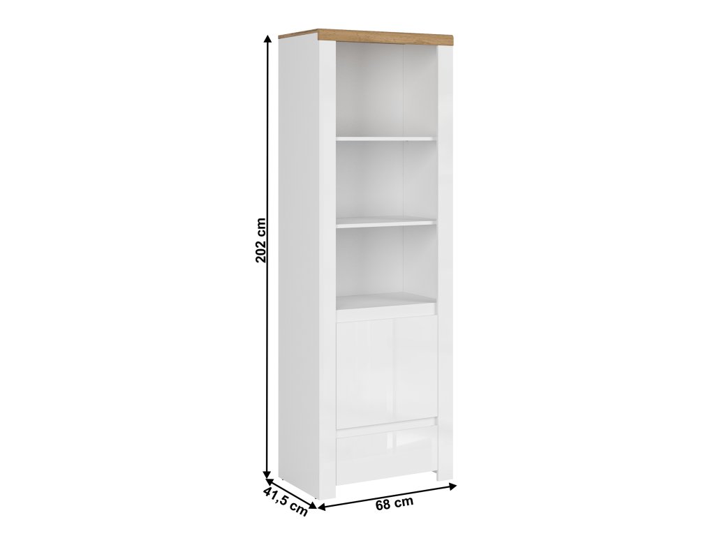 Materiál: DTD laminovaná/ABS hrany/MDF Farba: biely extra vysoký lesk/dub wotan Rozmery (ŠxHxV): 68x41,5x202 cm Výška spodného priestoru od podlahy: 5 cm Hrúbka materiálu: 1,6 - 2,2 cm Kombinovaný regál Obsahuje otvorené police, otváraciu skrinku a zásuvku Otvorený aj uzavretý úložný priestor V skrinke sú police Výška horných políc: 36 cm Výška spodných políc: 19 cm Výška zásuvky: 20,2 cm MDF dvierka Otváranie/zatváranie pomocou výrezu Dodávaná v demonteBalenie (počet kusov : 1)