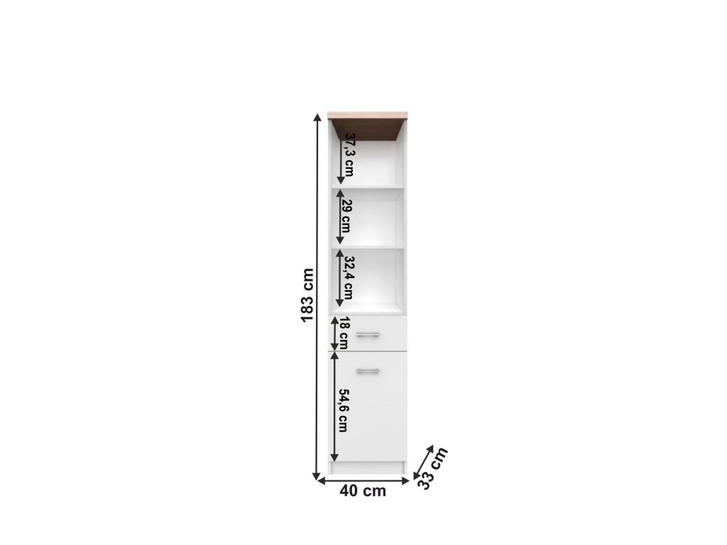 Regál 1D1S TOPTY TYP 04 Materiál: DTD laminovaná Prevedenie: biela/dub sonoma Rozmery (ŠxHxV): 40x33x183 cm Hrúbka materiálu korpus: 16 mm Hrúbka materiálu vrchnej dosky: 32 mm Dodávané v demonte.Balenie (počet kusov : 2)