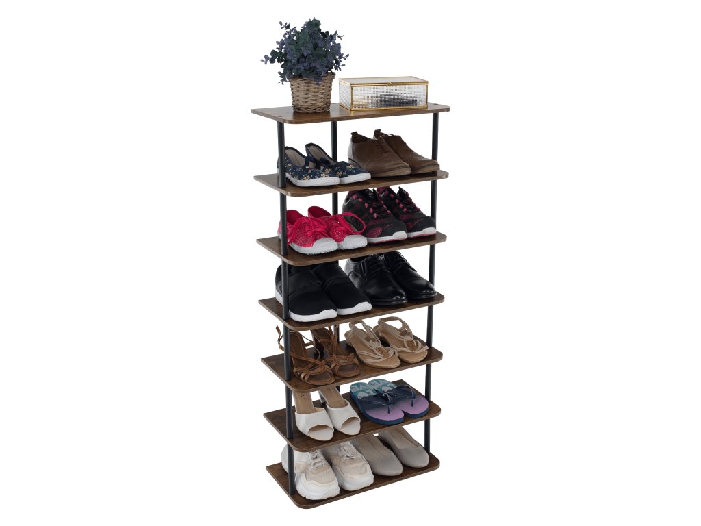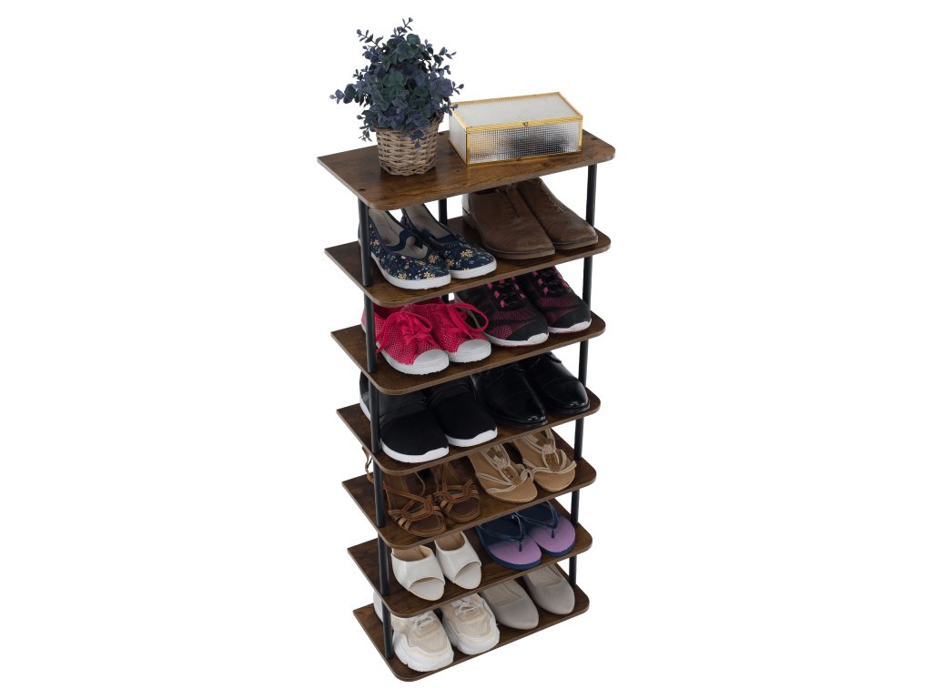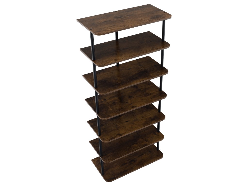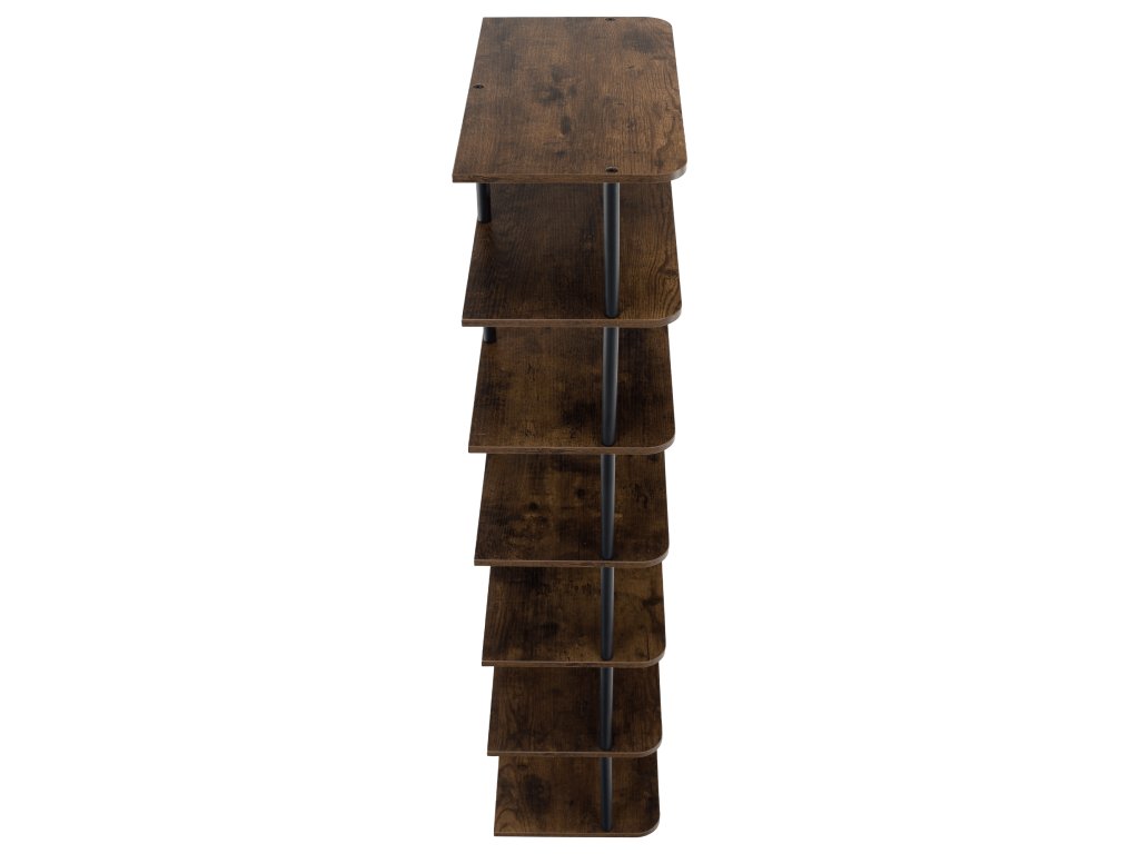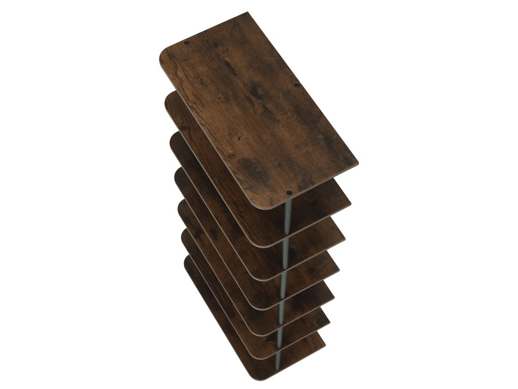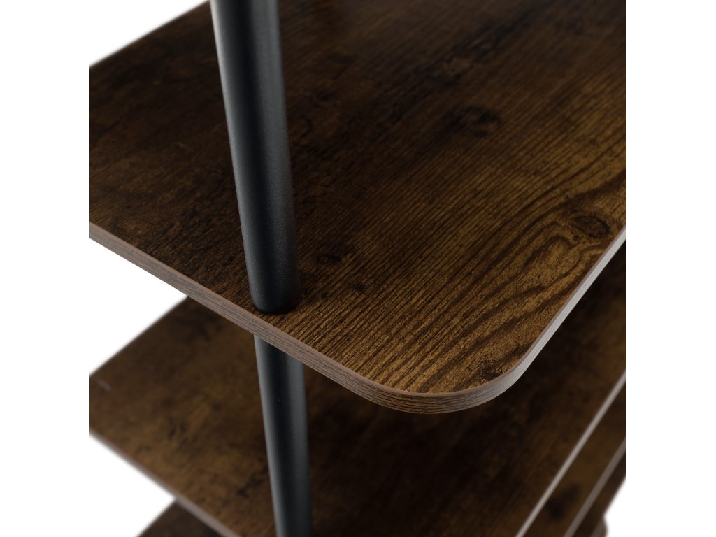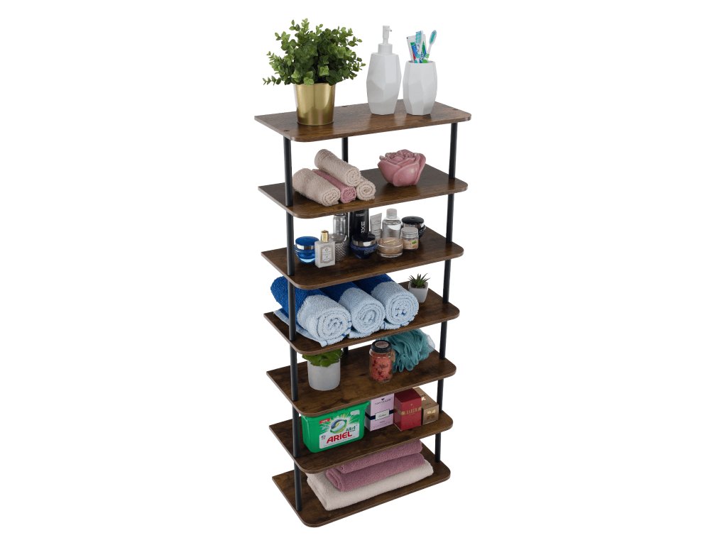 Materiál: kov/DTD Farba: čierna/rustikálne drevo Rozmery (ŠxHxV): 46x24x102,5 cm Hrúbka tyče: 1,6 cm Nosnosť na policu: 5 kg-10 kg Výška police: 16 cm 6-radový Viacúčelový Dodávané v demonteBalenie (počet kusov : 1)