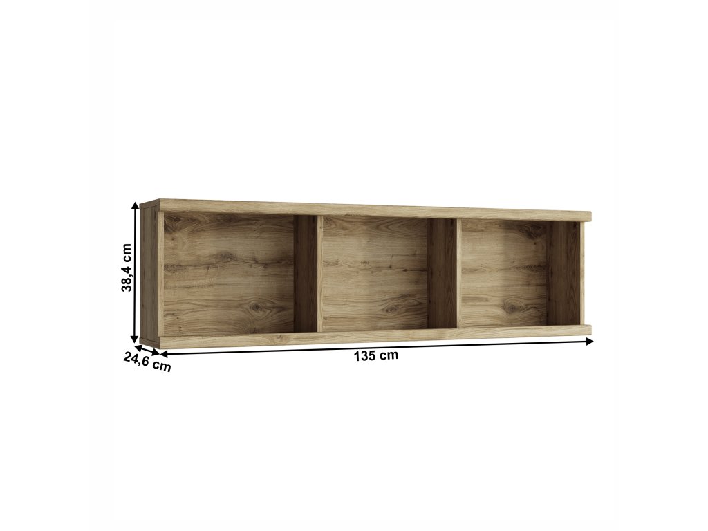 Visiaci regál DORSI 135 Materiál: DTD laminovaná Farba: dub navarra Rozmery (ŠxHxV): 135x24,6x38,4 cm Hrúbka materiálu: 1,6 cm So stredovou priečkou Spodná a vrchná lišta Otvorený úložný priestor 3 odkladacie časti Moderný dizajn Dodávané v demonteBalenie (počet kusov : 1)
