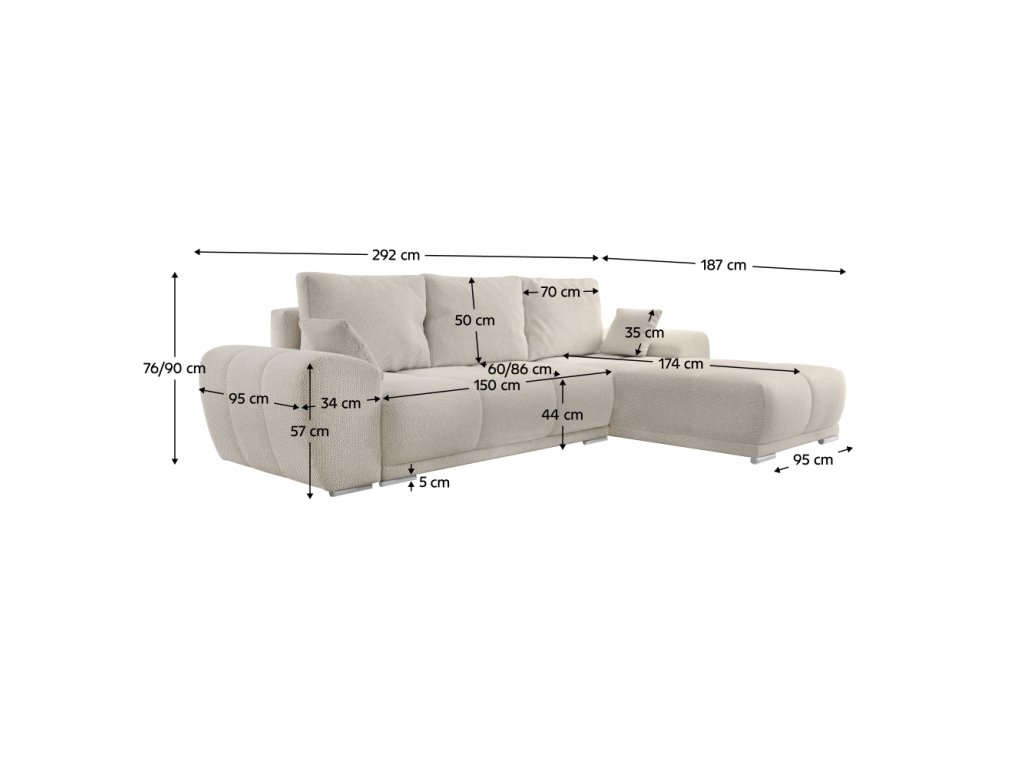 Materiál: látka Curio 02 Oderuodolnosť textílie podľa testu Martindale: 60 000 oderov Farba: krémová Rozmery (ŠxHxV): 292x187x76/90 cm Plocha na spanie (ŠxD): 135x225 cm Výška sedu: 44 cm Hĺbka sedu: 60/86 cm Rozmery otomanu (ŠxH): 95x174 cm Rozmery opierky na ruku (ŠxHxV): 34x95x57 cm Šírka sedacej časti: 150 cm Univerzálna Celočalúnená Rozkladacia Rohová S úložným priestorom Na nožičkách Materiál nožičiek: plast Farba nožičiek: strieborná Výška spodného priestoru od podlahy: 5 cm Výplň: pružina falista/pur pena S vankúšami Rozmery vankúšov (ŠxV): 70x50 cm Rozmery dekoratívnych vankúšov (ŠxV): 35x35 cm Praktická Moderná Dodávané v demonte Ponúkame vám možnosť vybrať si zo 6 farebných prevedení látky Curio za cenu 999 Eur. Pri individuálnej objednávke je potrebné zaplatiť 20% zálohu z danej sumy. Po uhradení zálohy bude Vaša požiadavka zadaná do výroby. Dodacia lehota 6-8 týždňov.Balenie (počet kusov : 4)