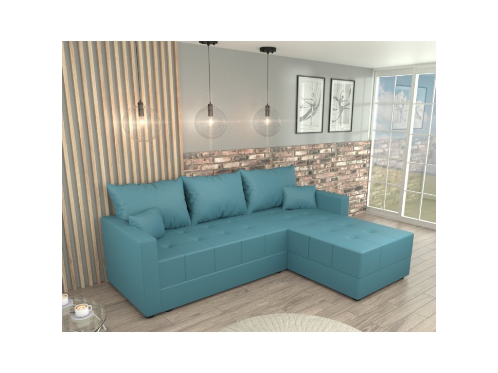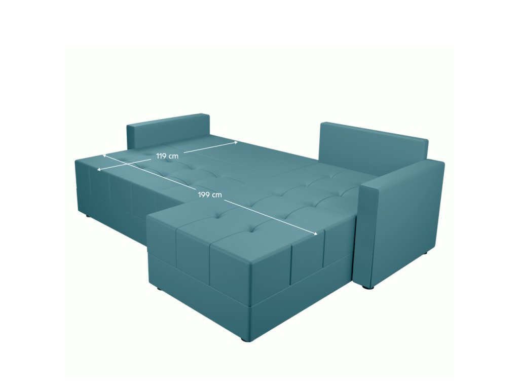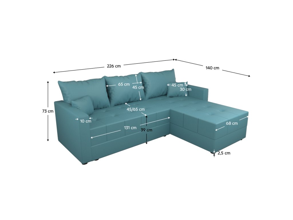 Materiál: látka Riviera 76 Oderuodolnosť textílie podľa testu Martindale: 90 000 oderov Farba: petrolejová Rozmery (ŠxHxV): 226x140x73 cm Rozkladacia Plocha na spanie (ŠxD): 119x199 cm Výška sedu: 39 cm Hĺbka sedu: 45/65 cm Šírka sedacej časti: 131 cm Šírka otomanu: 68 cm Na nožičkách Materiál nožičiek: plast Farba nožičiek: čierna Výška spodného priestoru od podlahy: 2,5 cm Výplň: PUR pena T28 Univerzálne prevedenie Rohová S úložným priestorom Dodávané s vankúšmi Rozmery dekoratívnych vankúšov (ŠxV): 45x30cm Rozmery opierkového vankúša (ŠxV): 65x45 cm Dodávané v demonteBalenie (počet kusov : 2)