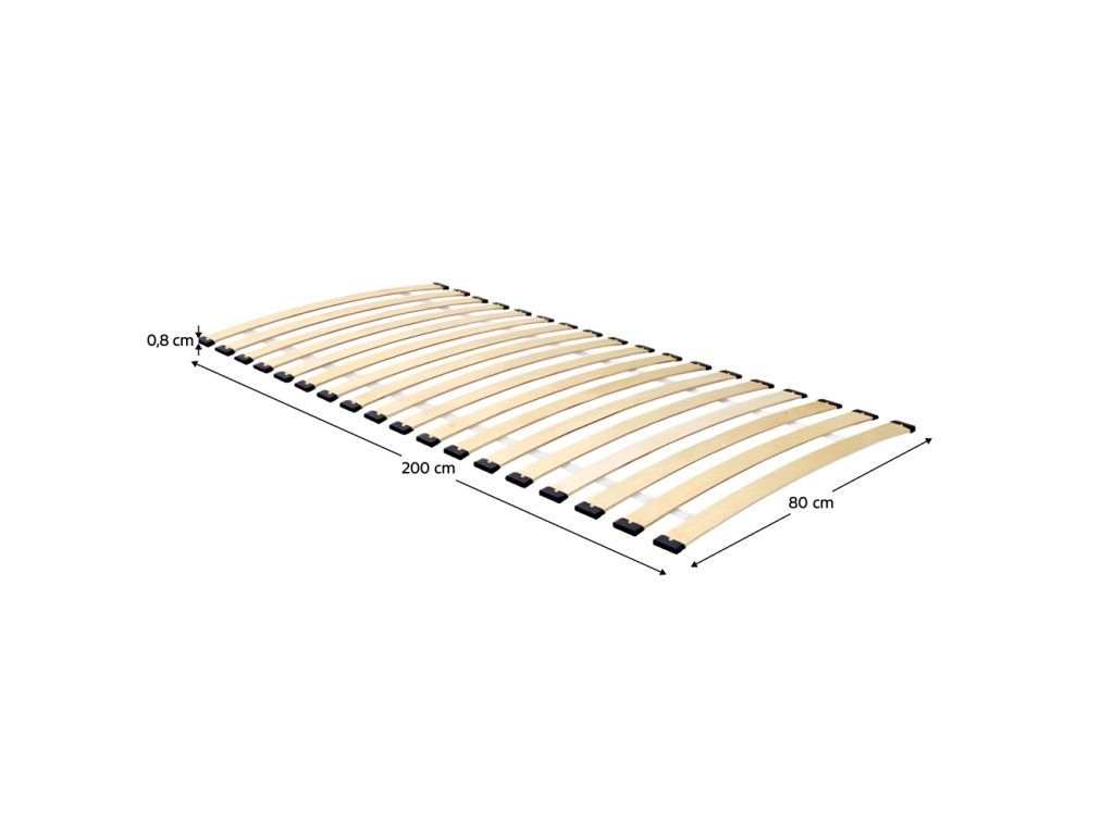 Materiál: ohybné lamely/čalúnnická páska/plastové puzdrá Prevedenie: brezová preglejka Rozmery (ŠxV): 80x200 cm Počet lamiel: 18 Hrúbka lamiel: 0,8 cm Šírka lamiel: 5,3 cm Priestor medzi lamelami: 5,5 cm Nosnosť: 150 kg/osoba Vhodný pre všetky typy matracov Bezrámová konštrukcia Vhodný do postelí s bočnými lištami na pripevnenie roštu Rolovaný rošt Lamely z brezovej preglejky spojené čalúnnickou páskou Osadené v plastových puzdrách Dodávaný so skrutkami na upevnenie k posteli Rošt nie je samonosný Každý rošt je o 1 cm užší a 5 cm kratší od udaného rozmeru, napr. 90x200 = 89x195 cm.Balenie (počet kusov : 1)