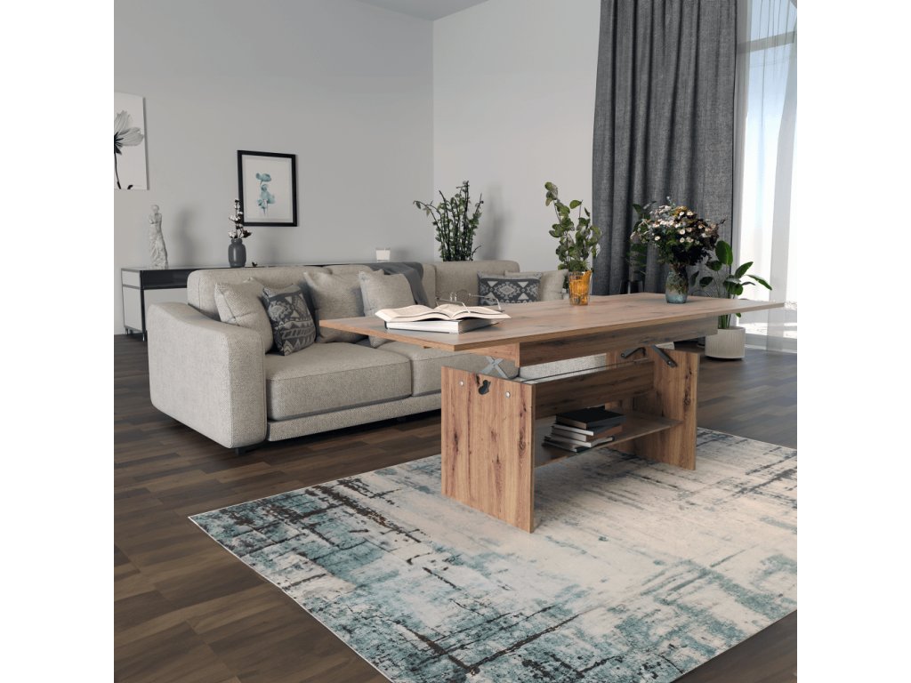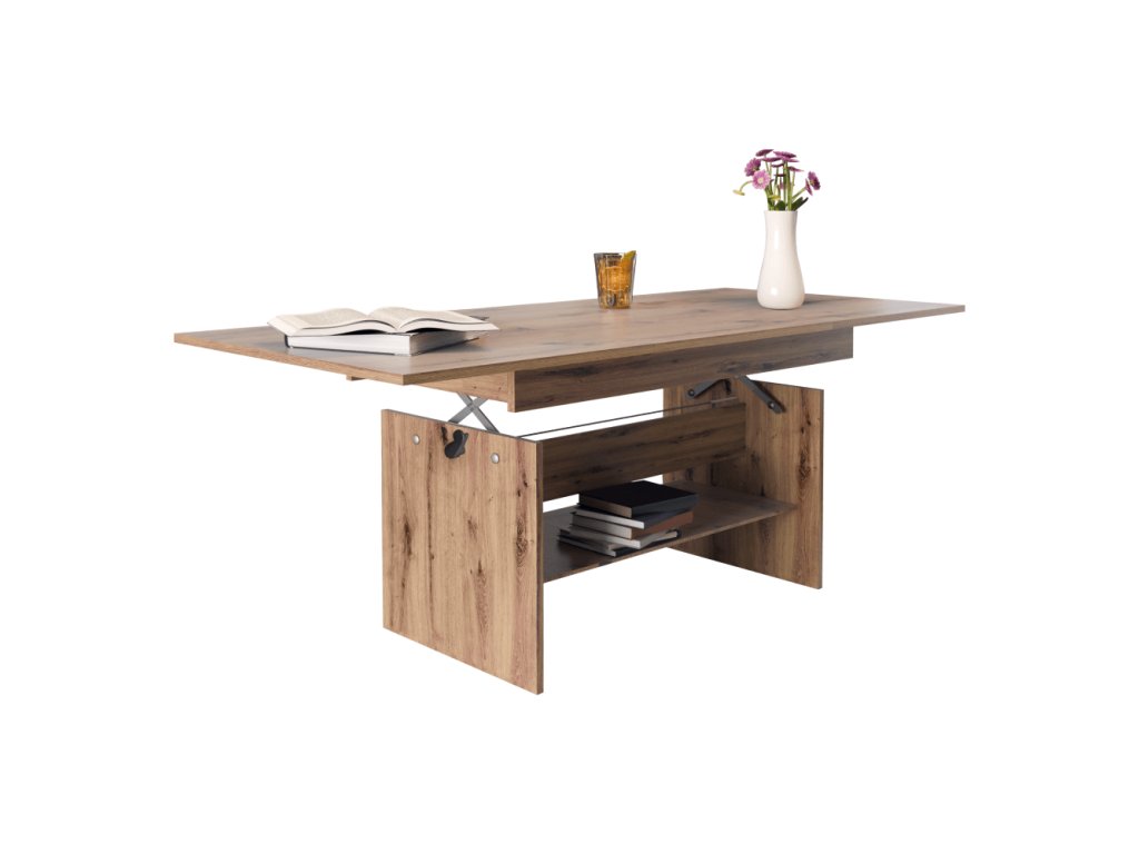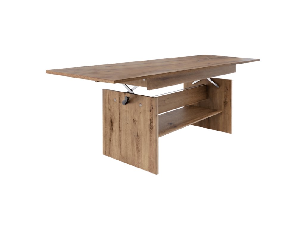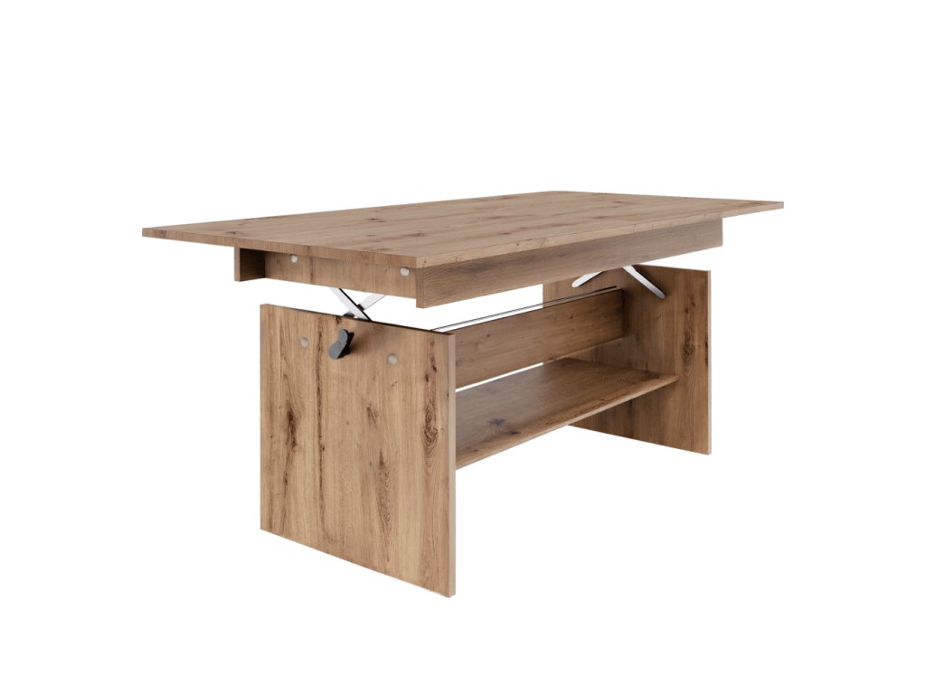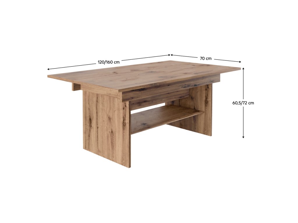Materiál: DTD laminovaná Farba: dub artisan Rozmery (ŠxHxV): 120-160x70x60,5-72 Hrúbka DTD laminovanej: 1,6 cm Konferenčný/jedálenský Rozkladací Výškovo nastaviteľný Disponuje zdvíhacím mechanizmom S policou Rozmery police: 88x30 cm Vhodný pre 4-6 osôb Nosnosť vrchnej dosky: 20 kg Moderný Dodávané v demonteBalenie (počet kusov : 3)