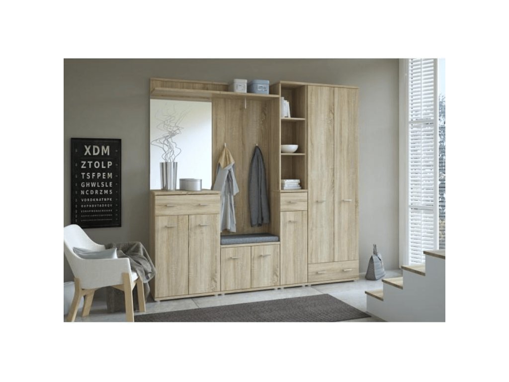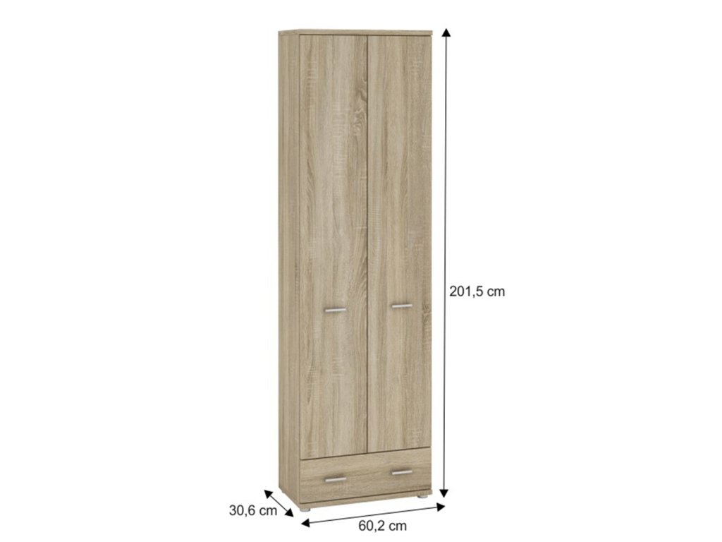 Skriňa Typ A komponent z predsieňovej zostavy MARIO NEW, Materiál DTD laminovaná, Farebné prevedenie: dub sonoma. Rozmery: (ŠxVxH): 60,2x201,5x30,6 cm. Hrúbka materiálu: 16/22 mm Dvierka majú hladké zakončenia.Balenie (počet kusov : 2)