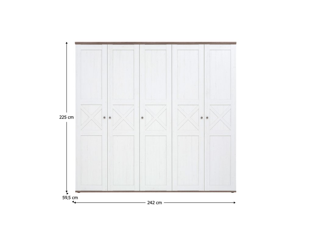 Materiál: laminovaná DTD Farba: borovica canyon/dub sonoma trufel Rozmery (ŠxHxV): 242x59,5x225 cm Hrúbka materiálu: 1,6 cm S úchytkami Materiál úchytiek: kov Farba úchytiek: stará strieborná Päťdverová Policová časť Nosnosť police: 5 kg Vešiaková časť Nosnosť vešiakovej tyče: 17 kg Moderný dizajn Odporúčame pripevniť k stene Dodávané v demonteBalenie (počet kusov : 6)