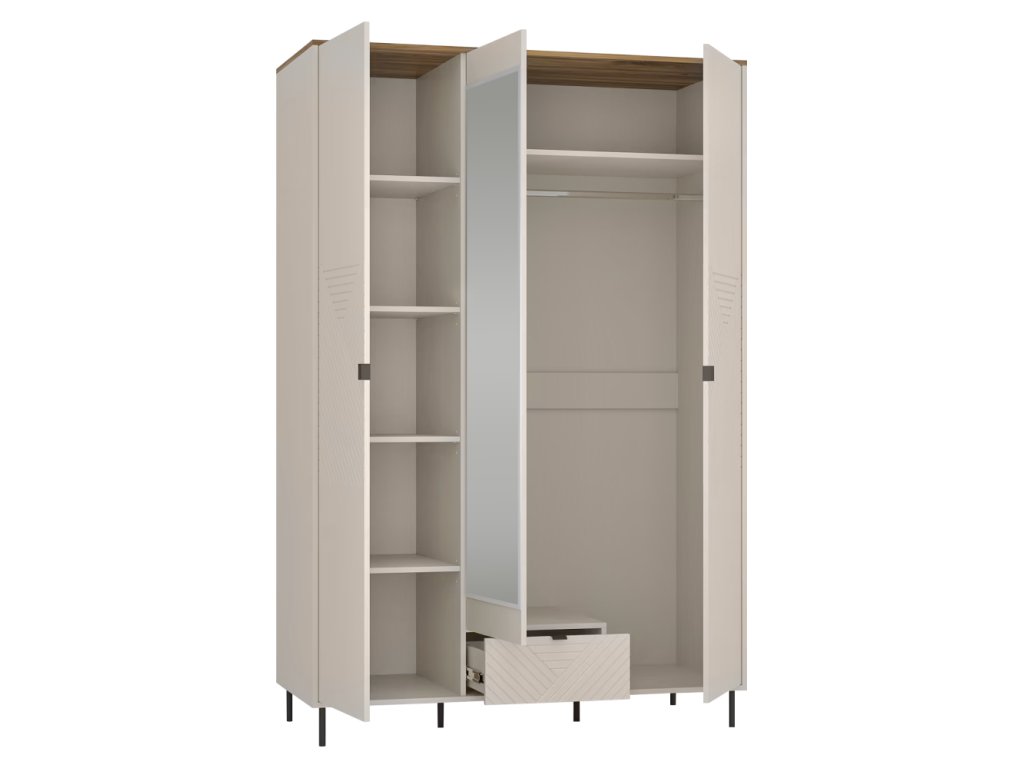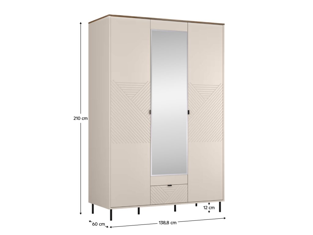 Materiál: laminovaná DTD/fóliovaná MDF/ABS hrany/sklo Farba: kašmír/dub castello Rozmery (ŠxHxV): 138,8x60x210 cm Hrúbka materiálu: 1,6 cm So zrkadlom Trojdverová Vešiaková tyč Policová Jedna zásuvka S úchytkami Materiál úchytiek: kov Farba úchytiek: čierna Na nožičkách Materiál nožičiek: kov Farba nožičiek: čierna Výška nožičiek: 12 cm Nosnosť vrchnej dosky: 30 kg Nosnosť vešiakovej tyče: 5 kg Nosnosť police a zásuvka: 5 kg Dekoratívne dvierka Moderný dizajn Odporúčame pripevniť k stene Dodávané v demonteBalenie (počet kusov : 4)