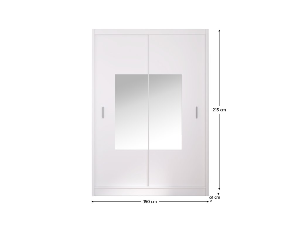 Materiál: DTD laminovaná/ABS hrany/MDF lišty/sklo Farba: biela Rozmery (ŠxHxV): 150x61x215 cm Hrúbka materiálu DTD: 1,6 cm S plastovými úchytkami Farba úchytiek: strieborná Tvar úchytiek: obdĺžnik So zrkadlom Dvojdverová S posuvnými dverami Vešiaková tyč Nosnosť vešiakovej tyče: 15 kg Policová časť Nosnosť police: 10 kg Nosnosť dlhej police: 20 kg Moderný dizajn Dovávaná v demonteBalenie (počet kusov : 3)