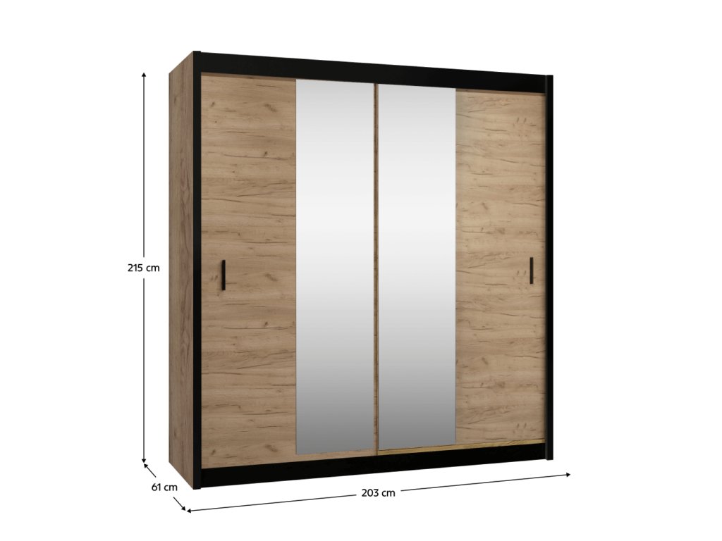 Materiál: DTD laminovaná/ABS hrany/MDF lišty/sklo Farba: dub craft/čierna Rozmery (ŠxHxV): 203x61x215 cm Hrúbka DTD: 1,6 cm Hrúbka ABS: 0,045 mm Nosnosť police: 10 kg Nosnosť dlhej police: 20 kg Nosnosť vešiaka: 15 kg Nosnosť šuplíka: 3 kg S posuvnými dverami S úchytkami So zrkadlom Policová časť Vešiaková časť Dvojdverová Dodávané v demonteBalenie (počet kusov : 3)
