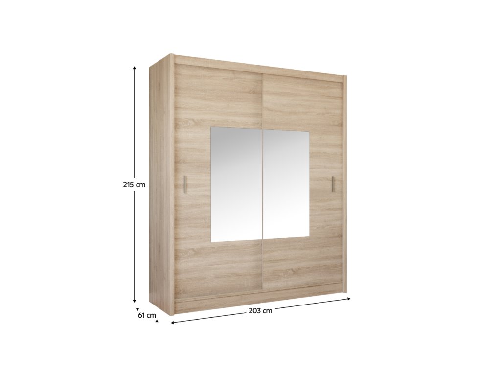 Materiál: DTD laminovaná/ABS hrany/MDF lišty/sklo Farba: dub sonoma Rozmery (ŠxHxV): 203x61x215 cm Hrúbka materiálu DTD: 1,6 cm S plastovými úchytkami Farba úchytiek: strieborná Tvar úchytiek: obdĺžnik So zrkadlom Dvojdverová S posuvnými dverami Vešiaková tyč Nosnosť vešiakovej tyče: 15 kg Policová časť Nosnosť police: 10 kg Nosnosť dlhej police: 20 kg Moderný dizajn Dovávaná v demonteBalenie (počet kusov : 3)