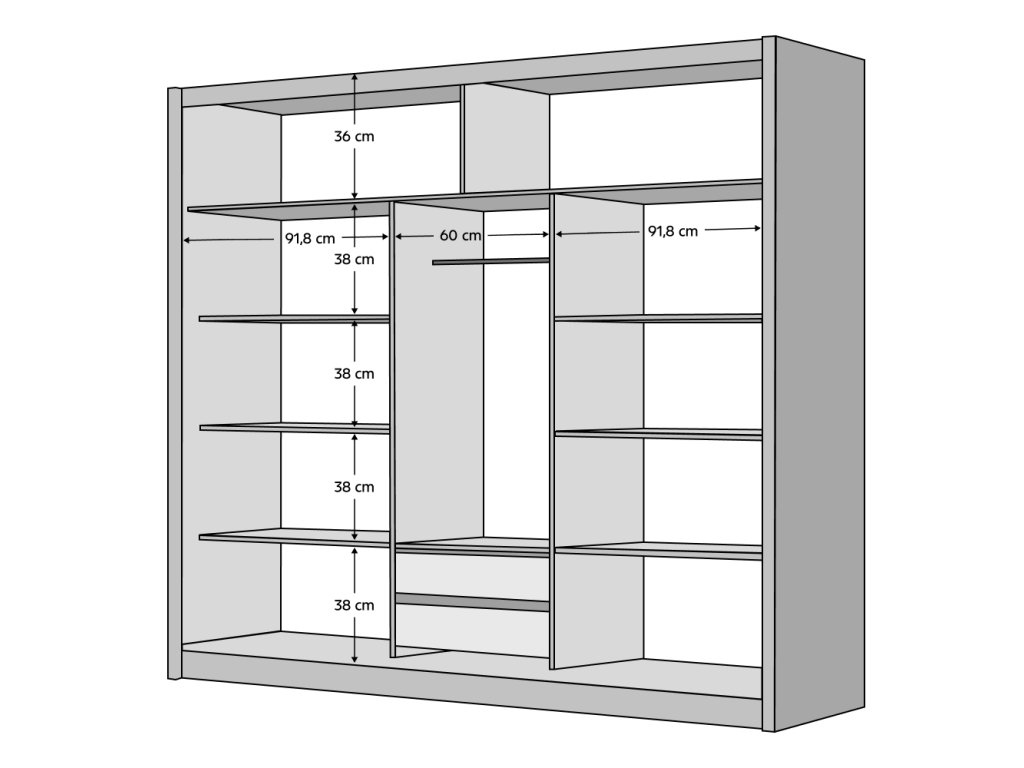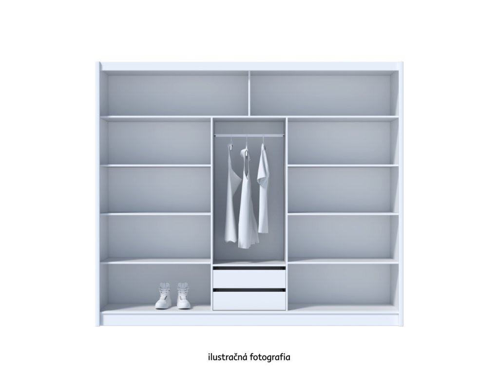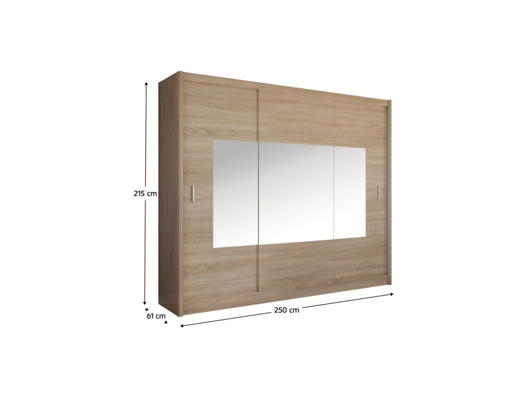 Materiál: DTD laminovaná/ABS hrany/MDF lišty/sklo Farba: dub sonoma Rozmery (ŠxHxV): 250x61x215 cm Hrúbka materiálu DTD: 1,6 cm S plastovými úchytkami Farba úchytiek: strieborná Tvar úchytiek: obdĺžnik So zrkadlom Trojdverová S posuvnými dverami Vešiaková tyč Nosnosť vešiakovej tyče: 15 kg Policová časť Nosnosť police: 10 kg Nosnosť dlhej police: 20 kg Šuplíky Nosnosť šuplíka: 3 kg Moderný dizajn Dovávaná v demonteBalenie (počet kusov : 4)