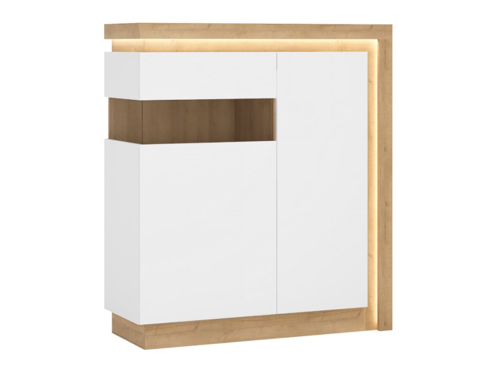 Komoda LYOV04L je výrazný kúsok, ktorý vás očarí nielen extra vysokým leskom, ale aj množstvom úložného priestoru vo vnútri. Komoda je dvojdverová. Biela je zaujímavo skombinovaná s odtieňom dub riviera. Dvierka v bielej farbe sú s extra vysokým leskom. Komoda ponúka dostatok úložného priestoru. V policovej časti je vnútro rozdelené na šesť úložných priestorov. LED osvetlenie po obvode je v cene.